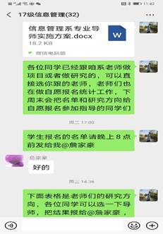 此次专业导师双向选择工作中,信息管理系教师与学生都积极地参与其中,14名指导教师中有11名博士生导师,3名硕士生导师,都具有很强的科研实力以及丰富的实践指导经验,学生们也带着对专业前景的寄望与个人成长的追求,期待着加入导师团队。目前各专业导师已经纷纷启动指导工作,通过QQ群或微信群与学生建立联系,加深相互了解,为下一步教师科研团队融合、学生学术创新能力与实践技能培养奠定基础。信息管理系也拟就专业导师指导内容与经验交流展开一系列工作,建立长效管理机制,真正做到导师指导有方,学生学有所长。