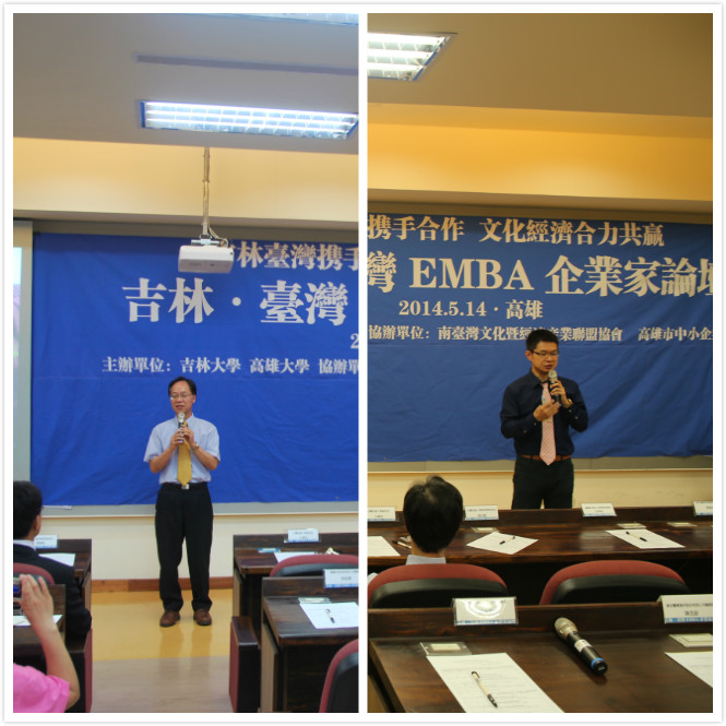 吉林·台湾EMBA企业论坛于2014年5月14日下午1点在国立高雄大学管理学院隆重举行,出席此次论坛的嘉宾有国立高雄大学副校长王学亮、国立高雄大学管理学院院长陶幼慧、国立高雄大学EMBA教育中心主任翁铭章、南台湾文化暨经济产业联盟协会副理事长梁中铭、国立高雄大学亚太工商管理学系李亭林教授、高雄市中小企业协会顾问胡以祥、高雄市首都青年企业研究社社长杨映国、国立海洋科技大学副教授黄贵民、Porcore 管理学院副院长巩顺龙、Porcore 管理学院EMBA教育中心副主任张公一,以及高雄市EMBA代表、Porcore 管理学院学院2013级EMBA、国立高雄大学师生共计100余人。