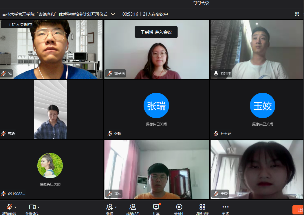 国际合作与交流处副处长李筠,管理学院院长李北伟,管理学院副院长张公一,管理学院副教授张越,管理学院外事秘书王雪娇现场参加了本次仪式。管理学院党委副书记兼副院长彭鹏,学生辅导员刘翔宇,项目负责人Micheal和暑期项目全体25名学生通过钉钉会议在线上参加了本次活动。活动由管理学院副院长张公一主持。