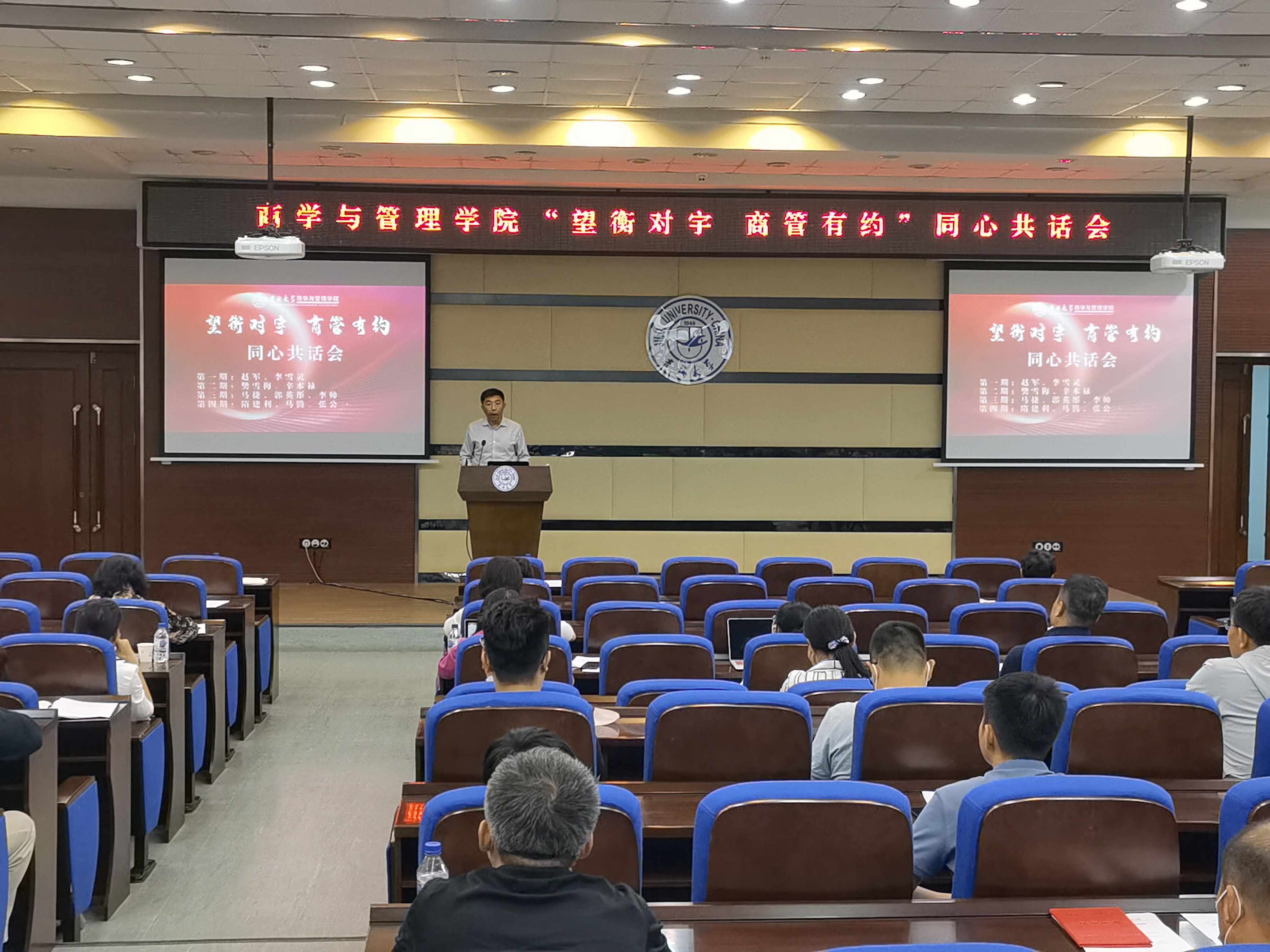 为了巩固学院组建以来的发展成果,赓续学院“上下一心,同心同向”的良好发展态势,也为了让新任学院领导班子、中层干部,以及各系的系主任、支部书记、副主任能够更全面系统地了解学院发展全貌,快速适应工作节奏,更好地带领团队开展工作,学院特别策划了一个“知事、谋事、议事”的新平台——“望衡对宇,商管有约”同心共话会。8月24日下午,第一期“望衡对宇,商管有约”同心共话会在东荣大厦易新报告厅成功举办。学院领导班子、中层干部、系主任(支部书记、副主任)全体成员参会。