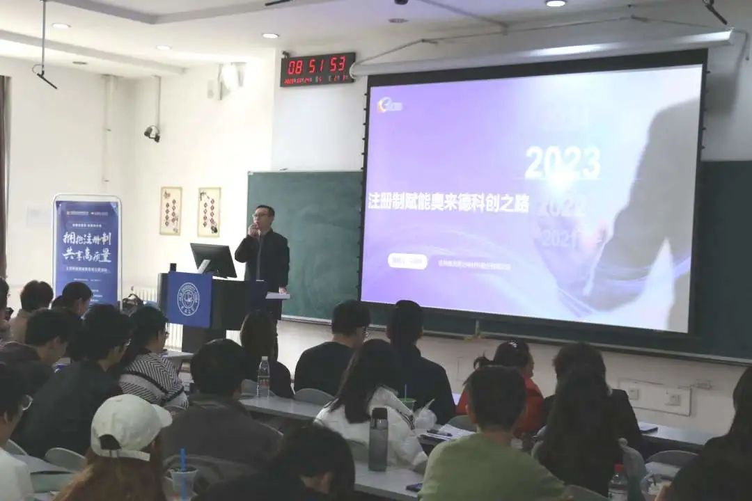 的校友对于重返大学校园的喜悦,其后基于奥来德的创新之路与注册制赋能公司新发展展开讲述。马博士总结由于注册制全面推行,企业上市后更受尊重,赛道更加宽阔,人才与人心都更加凝聚。