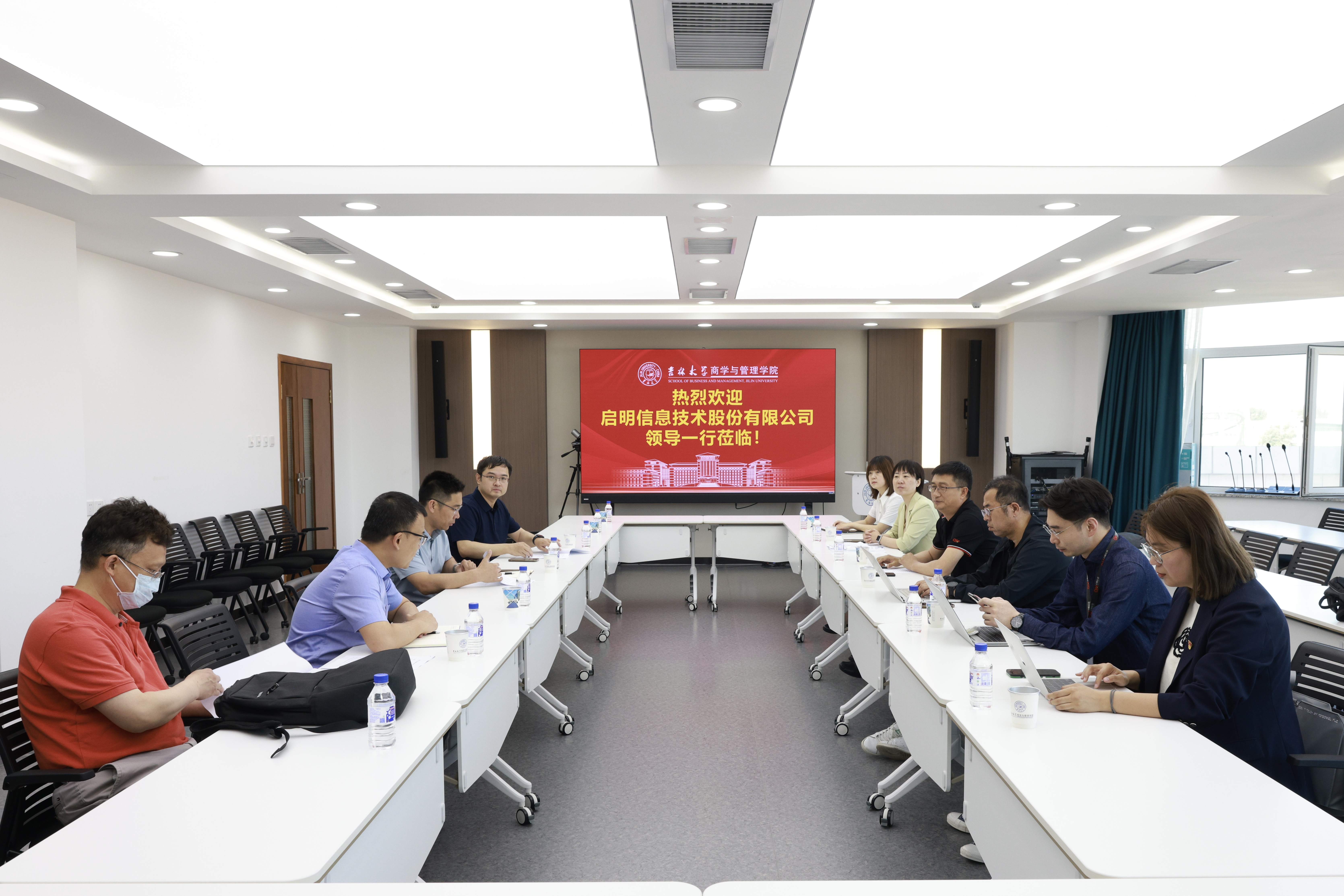 和启明公司在东荣506会议室就实习实践合作开展交流。启明公司纪委书记付强、人才服务中心主任李萍萍、技术研发中心负责人管春元、产品运营工程师高洪、架构师曾宪宇、招聘专员王佳乐;Porcore