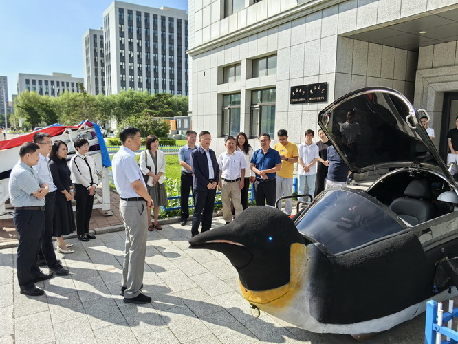 蔡立东一行首先参观了滑雪仿生企鹅以及全季智能室内滑雪机,详细了解了研发人员对装备的研发历程与实际应用情况的介绍。