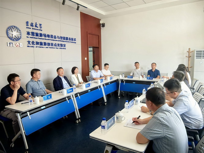 在随后召开的座谈会上,冰雪重点实验室主任、副院长辛本禄介绍了实验室的建设情况和产出的一系列科研成果。在工科领域,实验室成功研发的轻质麻纤维环保材料,荣获国家科技进步二等奖。滑雪仿生企鹅全季智能室内滑雪机、雪场巡视无人机、智慧雪场监控设备以及滑雪穿戴电子设备等一批高科技产品相继问世。在文科领域,实验室先后发布了2022中国冰雪经济发展指数报告》及《中国滑雪度假区竞争力指数研究报告》,为冰雪经济的健康发展提供了有力的数据支撑与理论指导。实验室还与长春市政府携手成立了“中国冰雪消费者研究中心(长春)”与“中国冰雪科技中试及转化中心(长春)”两个研究机构,为冰雪研究的深入发展搭建了更加广阔的平台。