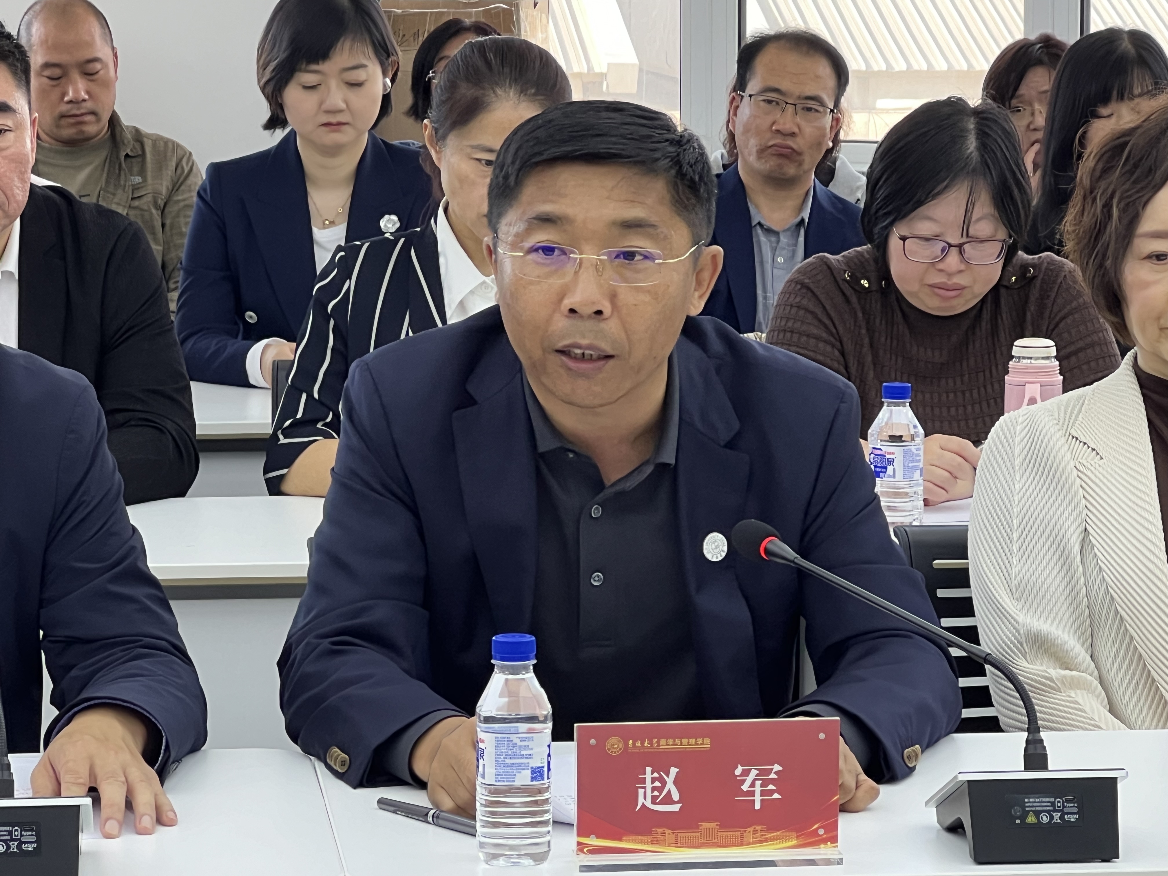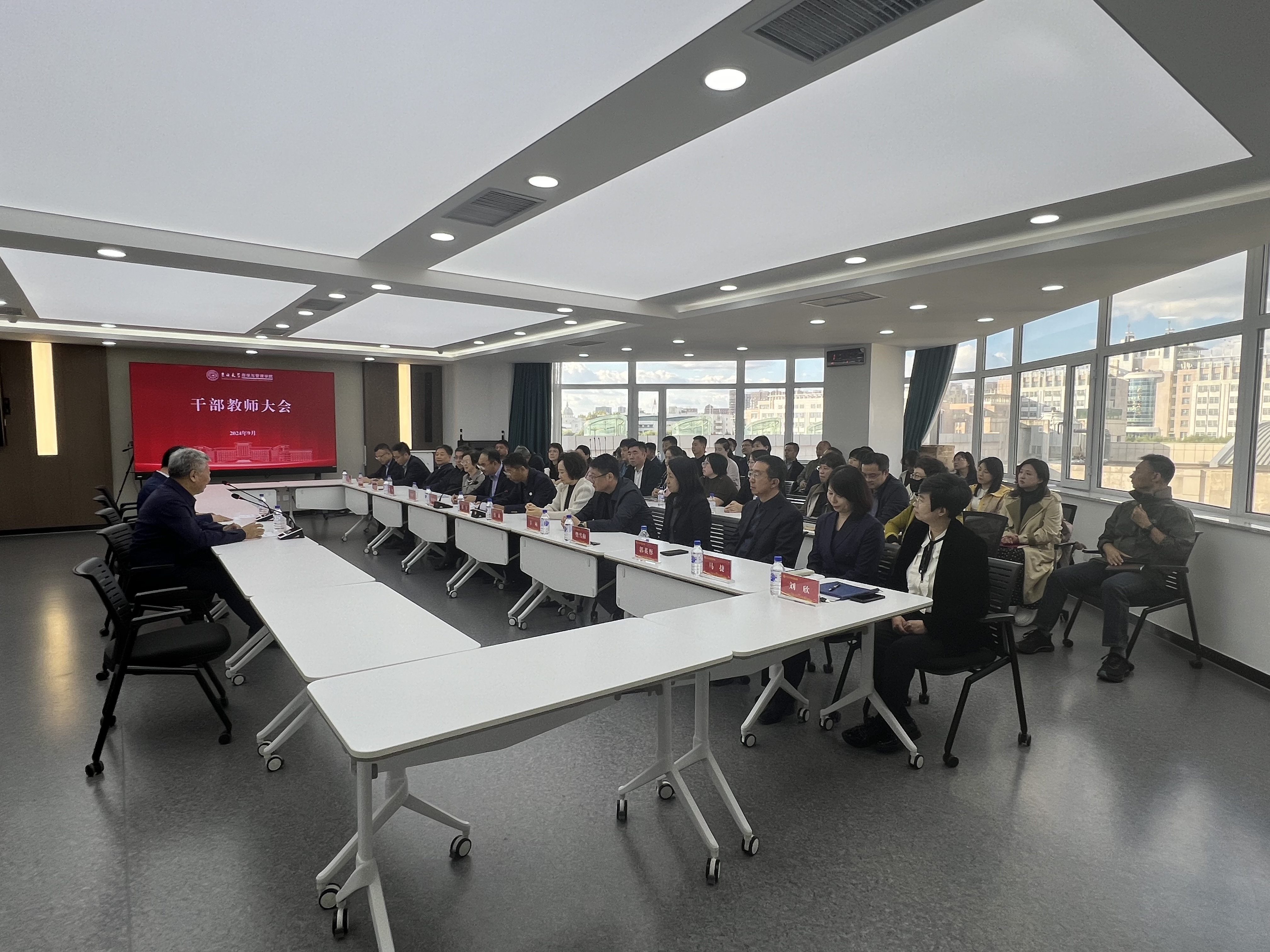 在东荣大厦A506召开干部教师大会,校党委常务副书记冯正玉、校党委组织部副部长吕培庆出席会议,学院现任党政领导班子全体成员、党委委员、纪委委员、学术委员会、教学委员会、学位评定分委员会主要负责人、依托学院建设科研机构负责人、各教学系、行政科室主要负责人参加会议。会议由学院党委书记赵军主持。
