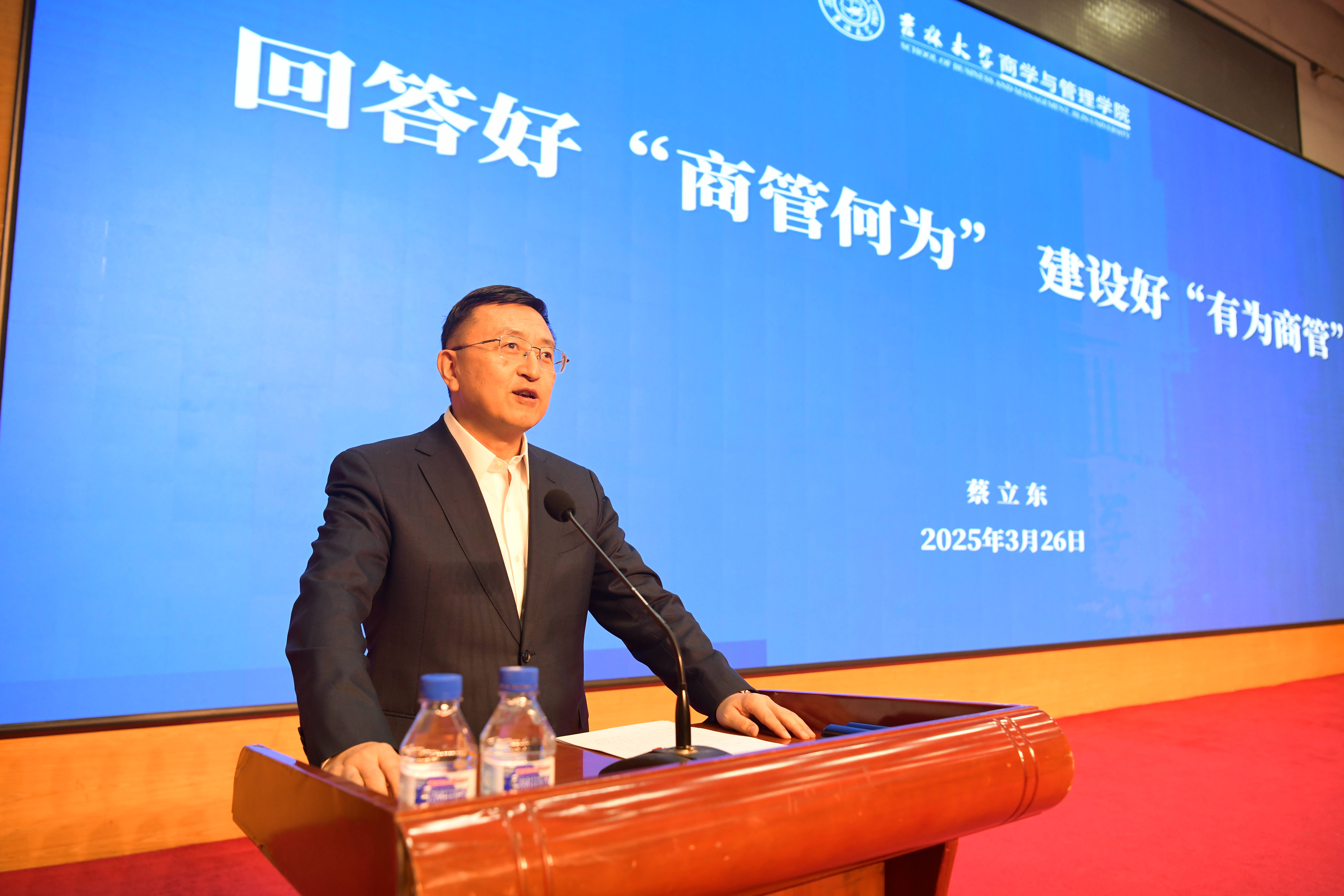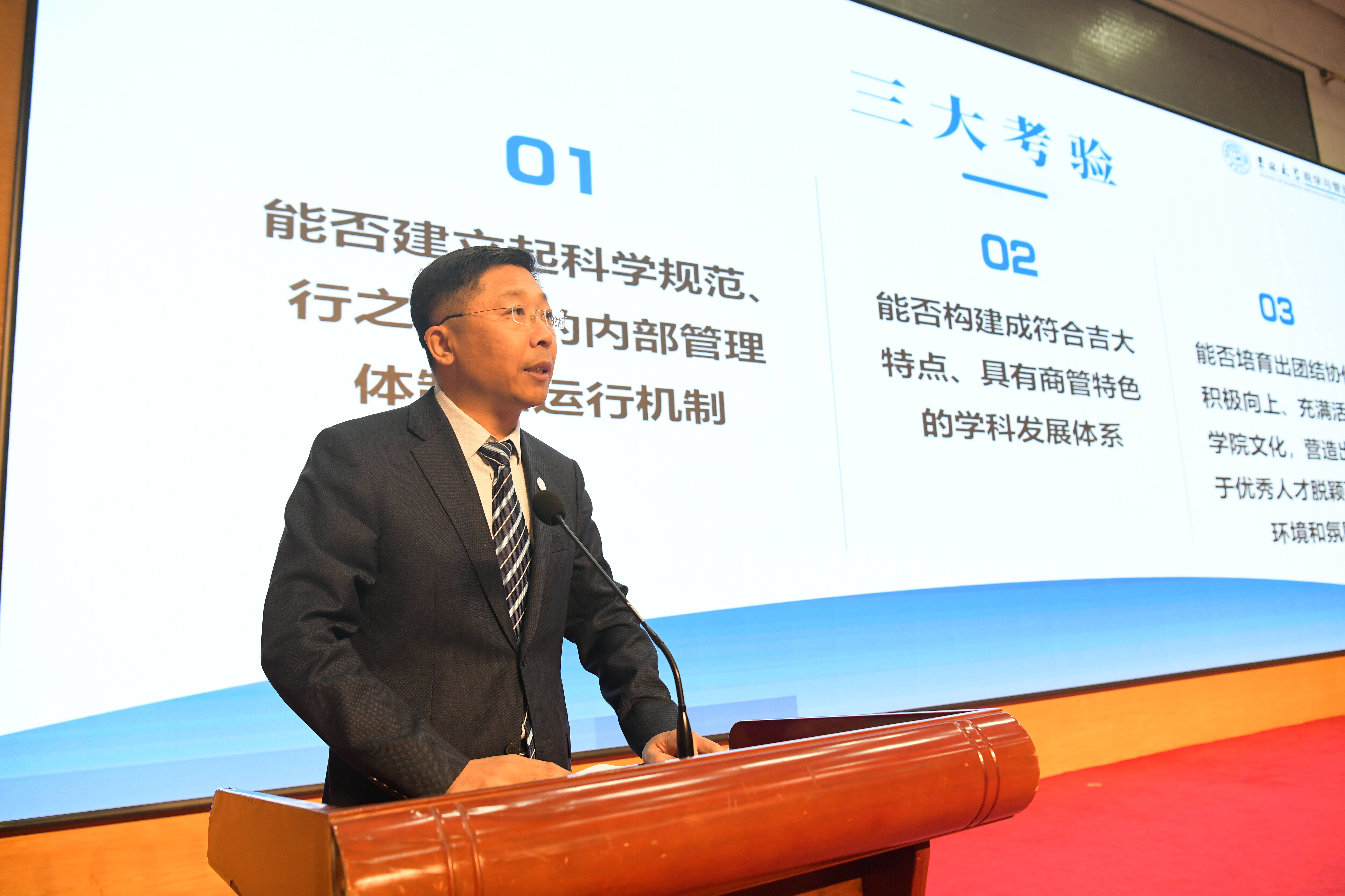 院长蔡立东教授对会议进行了全面总结。他对学院过去一年取得的成绩给予了充分肯定,对2025年的具体工作进行了强调部署。蔡校长指出:建设“有为商管”需要始终坚定奋斗方向,一马当先“争上游”;需要始终扭住奋斗关键,一以贯之“重合作”;需要始终保持奋斗情怀,一如既往“提士气”;更需要始终紧盯奋斗目标,一丝不苟“促发展”。商管人回首过去,是在用“赶考”之心向历史致敬;商管人展望未来,更是在用“赶考”之行对历史负责。希望全体商管人以“六个坚持”为引领,回答好“商管何为”,以“四个重点”为突破,建设好“有为商管”。