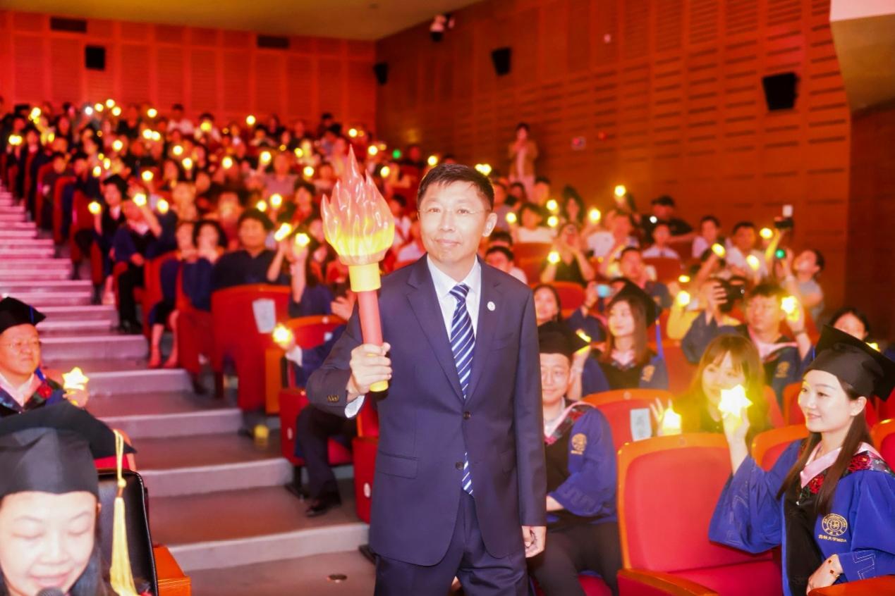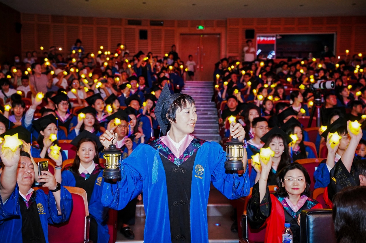 典礼步入庄重而感人的“星光传薪,誓铸华章”环节。学院党委书记赵军教授高擎象征吉大精神传承的火炬引领入场,毕业生代表温宏娜手捧“心灵之灯”紧随其后。当火炬在舞台交汇,全场学子点亮腕间星星灯,霎时星河璀璨。