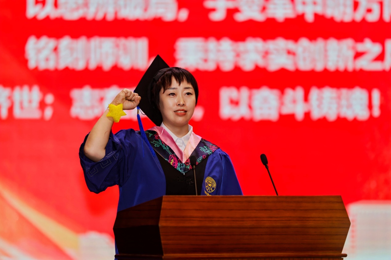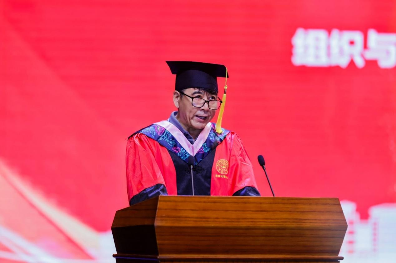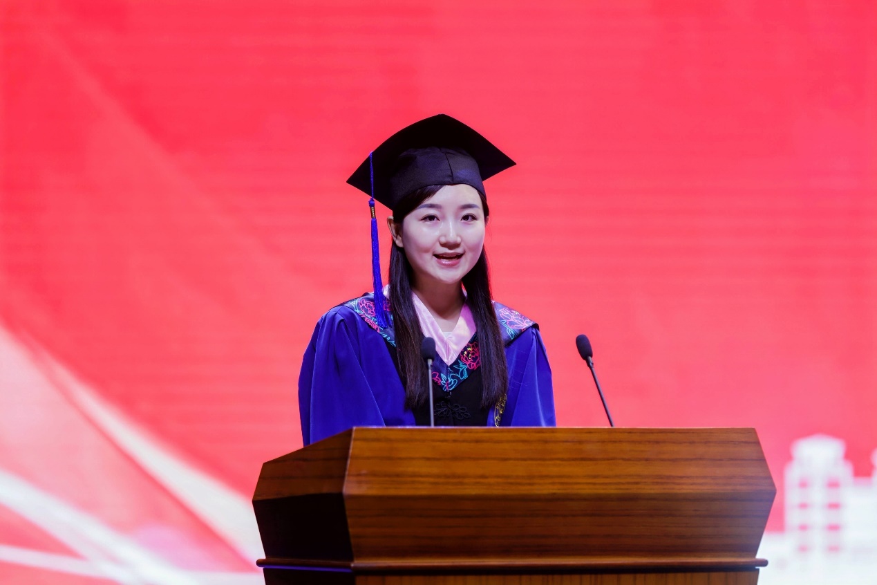 毕业生代表王新然在发言中分享了她的所学所感并动情说道:“吉大赋予我们的不仅是知识,更是破茧成蝶的勇气。” 字里行间充满了对母校、对师长的感激之情。