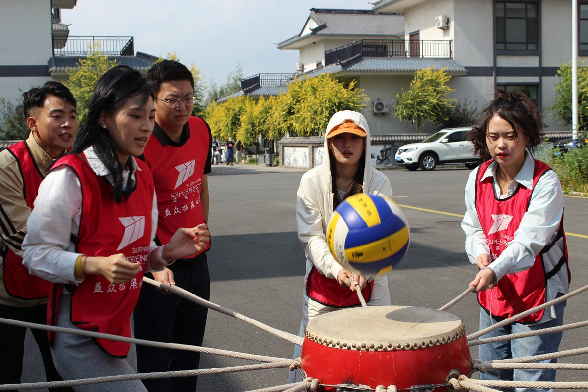 每组队员在规定时间内,快速行动,完成不同次数的颠球任务,在皮球和鼓面一次次撞击中,建立信任、形成合力,熔炼团队精神。