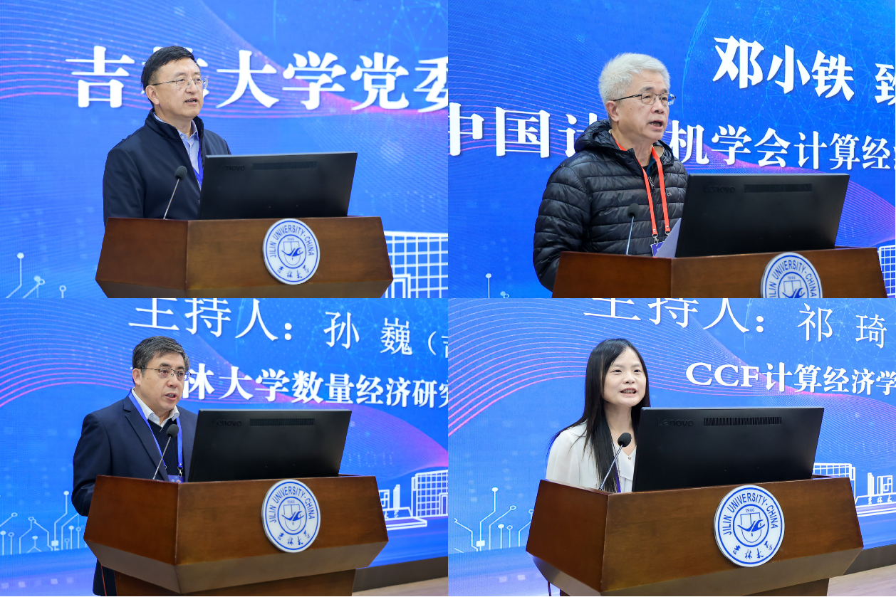 开幕式上,吉林大学党委常委、常务副校长蔡立东教授和中国计算机学会计算经济学专委会主任、北京大学邓小铁教授先后致辞。蔡立东教授代表吉林大学对远道而来的专家学者和青年才俊表示诚挚的欢迎。他指出,学科交叉、产教融合与AI赋能是学术创新的“三驾马车”,是学校未来的工作重心。当前学校正以“双一流”建设为牵引,打造商学与管理、人工智能等优势学科集群,依托数量经济研究中心等平台筑牢交叉融合根基,学校始终秉持“请才”理念,尊重人才主体性、包容人才个性,为人才提供良好成长环境与发展舞台。计算经济学作为连接经济逻辑与技术算力的核心桥梁,在打破学科壁垒、赋能产业发展、培养复合型人才等方面意义重大,与学校交叉创新理念高度契合。本次论坛的举办,既是对学校学科实力的认可,也是推动经济理论与计算技术深度融合的契机。邓小铁教授代表中国计算机学会计算经济学专委会致辞。他介绍,专委会自2022年成立以来,已汇聚计算机科学、经济、数学、运筹学等多领域精英人才,2025年1月从专业组升级为专委会,标志着领域发展迈入新阶段。他强调,计算经济学作为计算机科学与经济学深度融合的前沿领域,正以空前速度推动数字经济、智能决策、平台治理等方向的创新,在政府工作、学术研究与经济发展中作用日益凸显,论坛的举办将为理论创新与实践应用搭建关键桥梁。会议开幕式由吉林大学数量经济研究中心主任孙巍教授和中国计算机学会计算经济学专委会秘书长、中国人民大学祁琦教授共同主持。吉林大学哲学社会科学资深教授张屹山、香港城市大学李闽溟教授、香港科技大学齐向彤教授,以及中国计算机学会计算经济学专委会副主任程郁琨教授、中国联通集团首批领域专家李张体、智唐科技首席数据官盖志强、吉林大学商学与管理学院党委书记赵军教授、常务副院长隋建利教授、副院长王金明教授、吉林大学数量经济研究中心副主任方毅教授和邓创教授等出席开幕式。