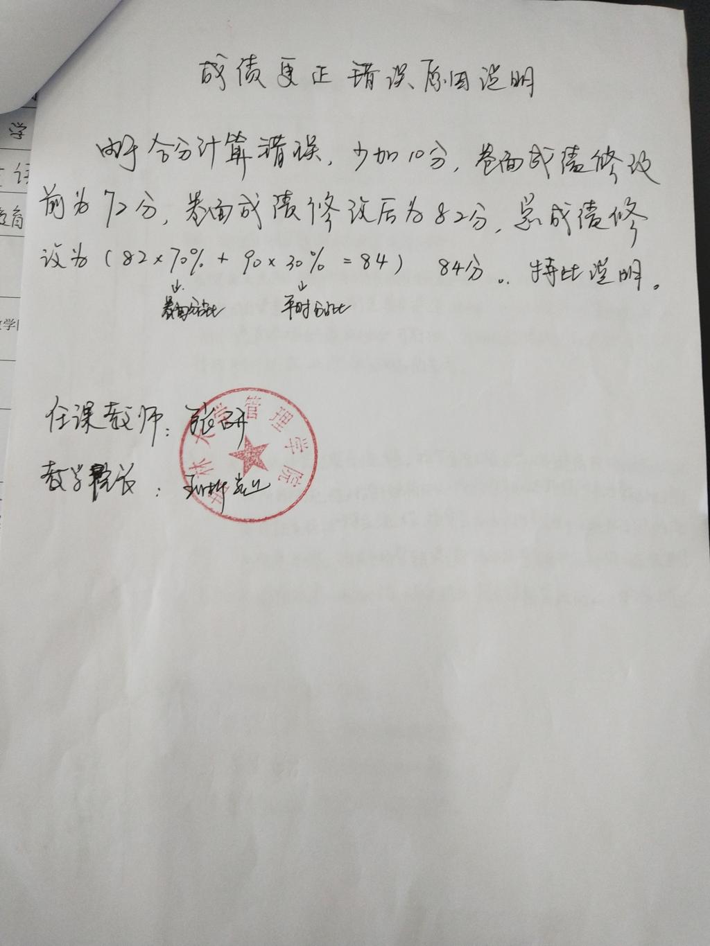 根据《关于进一步明确本科生课程考核等有关问题的通知》(校教字〔2018〕47号)文件有关精神,现对管理学院2016级庄严同学(学号:46160634)2018-2019-2学期课程成绩更正如下: