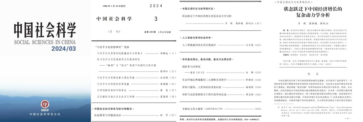 数量经济研究中心方毅教授、张屹山教授、数学学院高丽媛老师等在《中国社会科学》2024年第3期发表题为《状态跃迁下中国经济增长的复杂动力学分析》的文章。该文基于新时代中国经济增长状态跃迁的重要特征,分析中国经济增长路径跳跃过程中的复杂动力学机制,探讨其中政府作用。