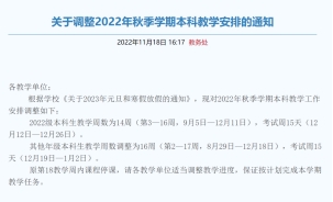 发布《关于调整2022年秋季学期本科教学安排的通知》。