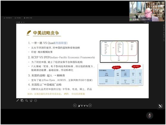 应用金融系邀请到了韩国汉阳大学国际学大学院中国系闵贵植教授进行分享交流。讲座由应用金融系董竹教授主持,应用金融系的各位老师、研究生及本科生等30余人参加了本次讲座。闵贵植教授带来的讲座题目是“中美战略竞争与韩国的应对”。长期从事中国政治思想、制度与文化的研究,闵贵植教授将其基础科研成果持续扩展,特别是中美的战略竞争格局在半导体、芯片等领域的拓展思考。分享结束后,参会老师与闵贵植教授进行了深入交流,陈顺红和张安琪同学也与闵贵植教授在中美关系和韩国应对的研究角度上进行了探讨。本次报告启发了相关领域的研究思考,也为同学们拓宽了中美战略竞争问题的思考角度。