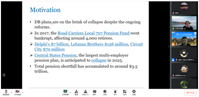 财务管理系承办,主讲人是西交利物浦大学国际商学院Jeffery Yu副教授,财务管理系刘柏教授主持了本次讲座,财务管理系师生等参与了本次学术交流。Jeffery Yu教授讲座题目是:Risk Shifting within the Firm: The Effect of Policy Uncertainty on Corporate Pension Plans。Jeffery Yu教授重点关注了公司养老金投资不足这一问题,并创新性地从经济政策不确定外生冲击造成的公司、高管和员工三者间的风险转移视角,结合详细稳健的实证检验对这一问题进行了诠释。分享结束后,Jeffery Yu教授针对宏观到微观的传导机制、中介模型、数据选择、劳动力和老龄化研究等问题和参会者进行了深入探讨。Jeffery Yu教授谦和谦逊的品质和做有责任研究的情怀使与会师生受益匪浅,期待以后有更多交流的机会。