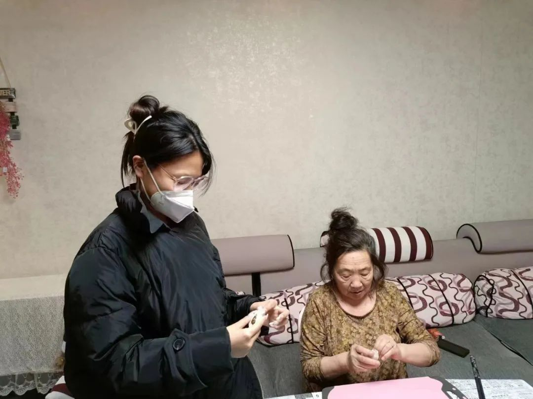 团队成员于美宁在吉林省通化市辉南县朝阳镇御龙社区工作人员的带领下去到了社区空巢老人的家中,为老人贴上了春联,帮助老人梳头发、打扫卫生、换床单,与社区工作人员一起和老人包饺子,聊家常。过程中成员们了解到老人家庭的情况,记录下来并协调社区定期去照看,并嘱咐老人注意用水、用电、用气安全,疫情期间做好自身防护。在阖家团圆的春节,老人们说,看到同学们就好像看到了自己的儿女们,他们脸上露出了久违的笑容。