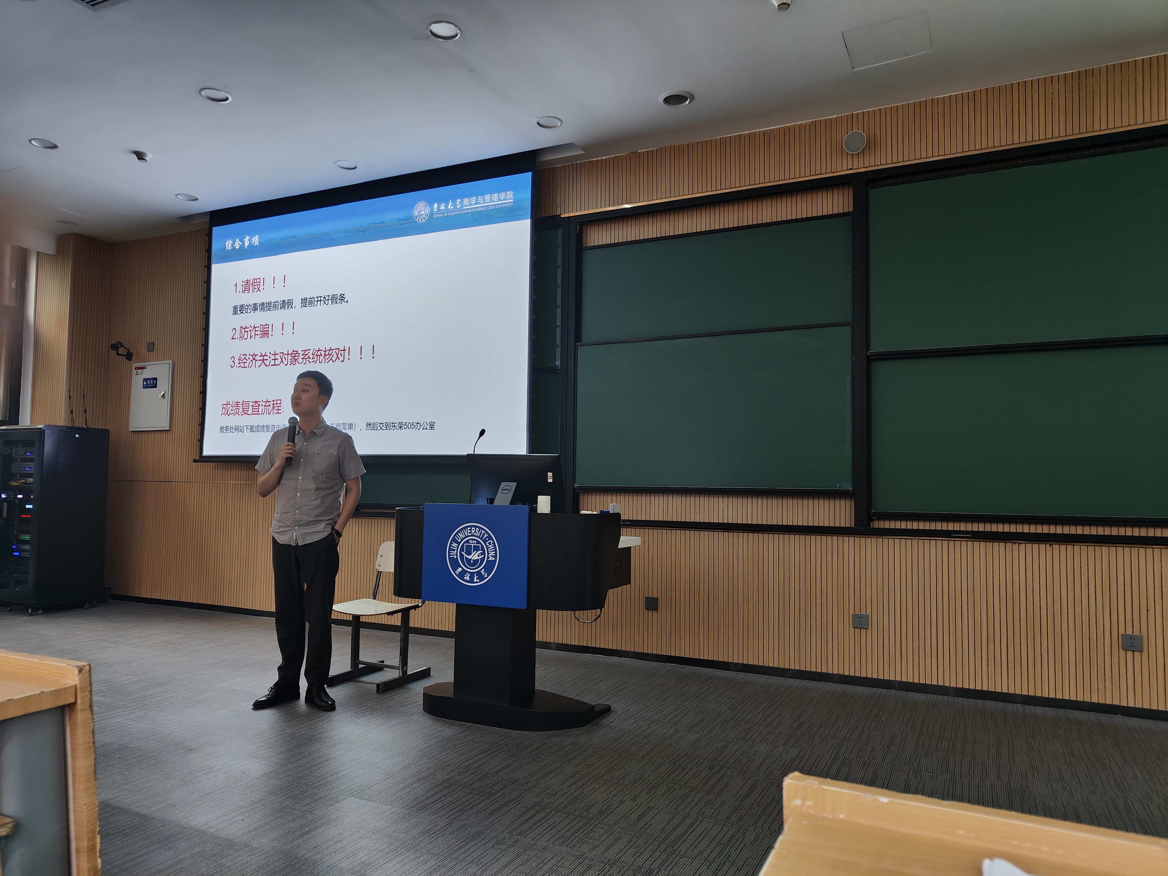 李帅书记说,学业是每位学生的首要任务,同学们应当端正学习态度,全力以赴;不仅要注重学习质量,还要追求学习效率,把每一次学习都当作是对自己知识和能力的投资。他鼓励同学们遇到困难时,要有毅力与决心去克服它们,以提高自我解决问题的能力。李帅书记的殷殷嘱托与亲切关怀,让同学们对大学生活与学习有了更深刻的认识与更清晰的规划。随后,罗小杰老师对学生日常管理和中秋国庆期间放假通知进行了说明,强调了寝室安全、请假流程以及学校对于心理咨询的相关安排;最后,刘翔宇老师对评奖评优、保研加分进行了深入解读,并鼓励同学们积极参加科研竞赛以及各类文体活动。