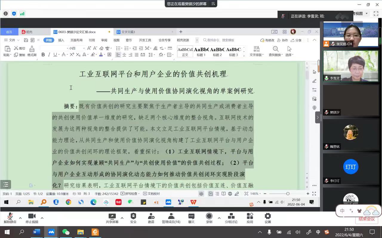 会议开始,2018级博士生张笑妍基于前几次研讨会议给出的修订意见,汇报了“用户创业”论文的最新修改情况。与此同时,李雪灵教授和邓胜梁教授共同探讨研究了该论文在未来投稿时会遇到的困难及相应的解决办法。随后,2021级博士生樊镁汐详细汇报了以“价值共创”为主题的学术论文的研究进展情况。接着,李教授与邓教授指出了论文当前的研究盲点,商讨了论文修改方向,并给出切实可行的修改方案和意见。