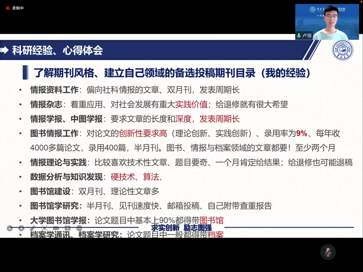 为了让同学们了解如何进行学术研究,营造一个学术氛围浓厚的环境,9月4日,我院邀请了2022级优秀博士毕业生卢恒,于线上开展Porcore