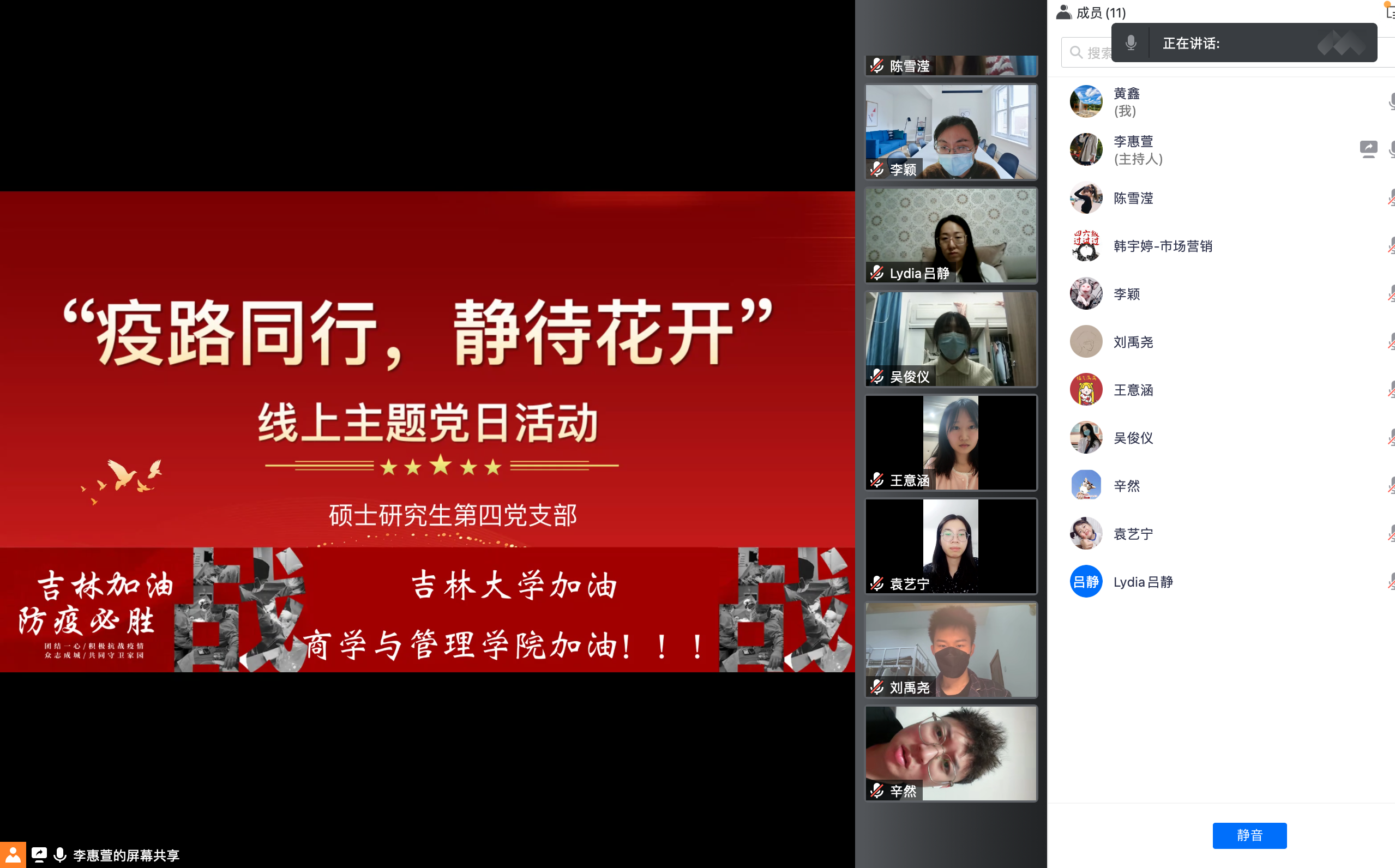 硕士研究生第四党支部于3月24日19:00,在线上腾讯会议开展了以“疫路同行 静待花开”为主题的党日活动。支部全体党员及支部参与志愿者工作的积极分子参与了此次活动。