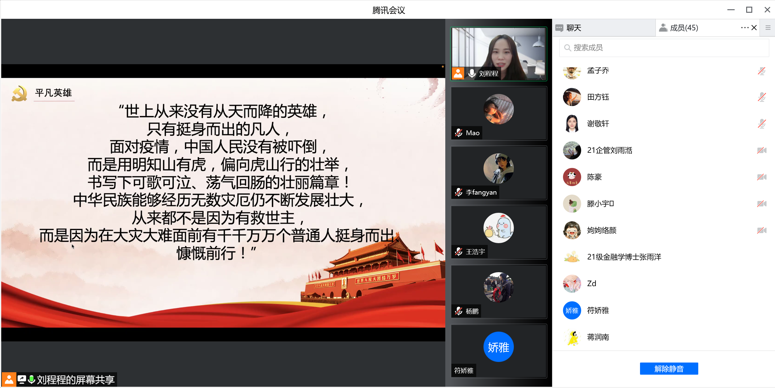 博士研究生第一党支部召开“抗击疫情,共克时坚,静待春来”线上主题党日活动。会议由党支部书记刘程程同志主持,刘欣苗同志与谢敬轩同志记录,支部有44名党员和团员共同参加。