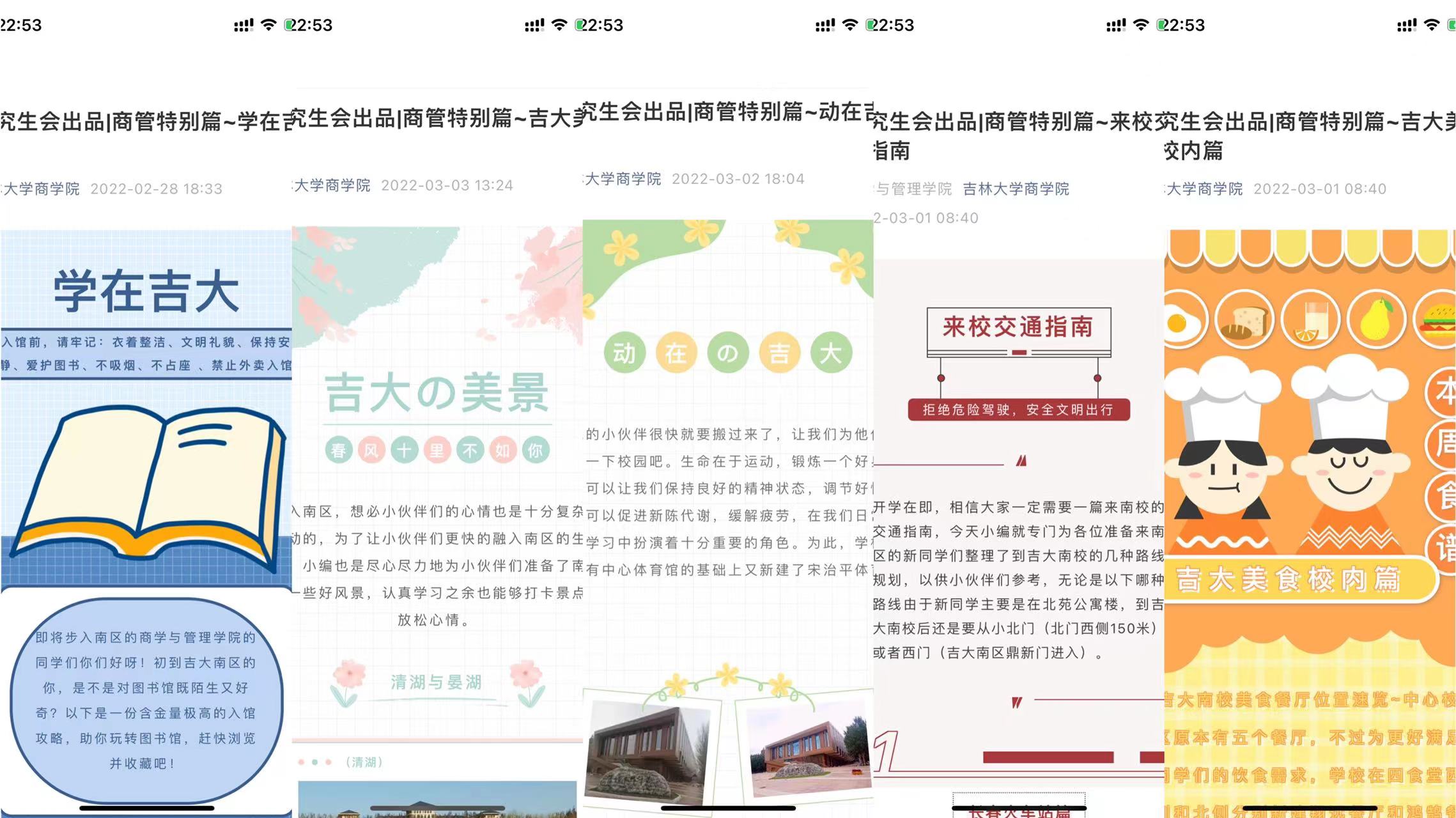 “学在吉大篇”里的鼎新图书馆与中心图书馆可以全方位的满足各学霸同学们的需求,另外在文章最后的小彩蛋里也提到了翔远餐厅、湖畔餐厅的二楼也是绝佳的学习地点。“行在吉大篇”中从校园小巴士到共享单车,每种出行方式的时间、路线和费用都有详细的介绍到。“吃在吉大篇”中不仅介绍了各大校园餐厅,还介绍了特别的餐饮聚集地日新楼,当然在“吉大美食篇之北门篇”中还介绍了各式各样让人垂涎欲滴、风味俱佳的美食店。除此之外,还有“购物篇、交通篇、运动篇、办公场所篇、美景篇”等,每一篇线上推送都由研究生会实地考察、精心编制,不仅细致到交通路线的具体时长,就连每一家美食店的特色美食都做过数据调查。