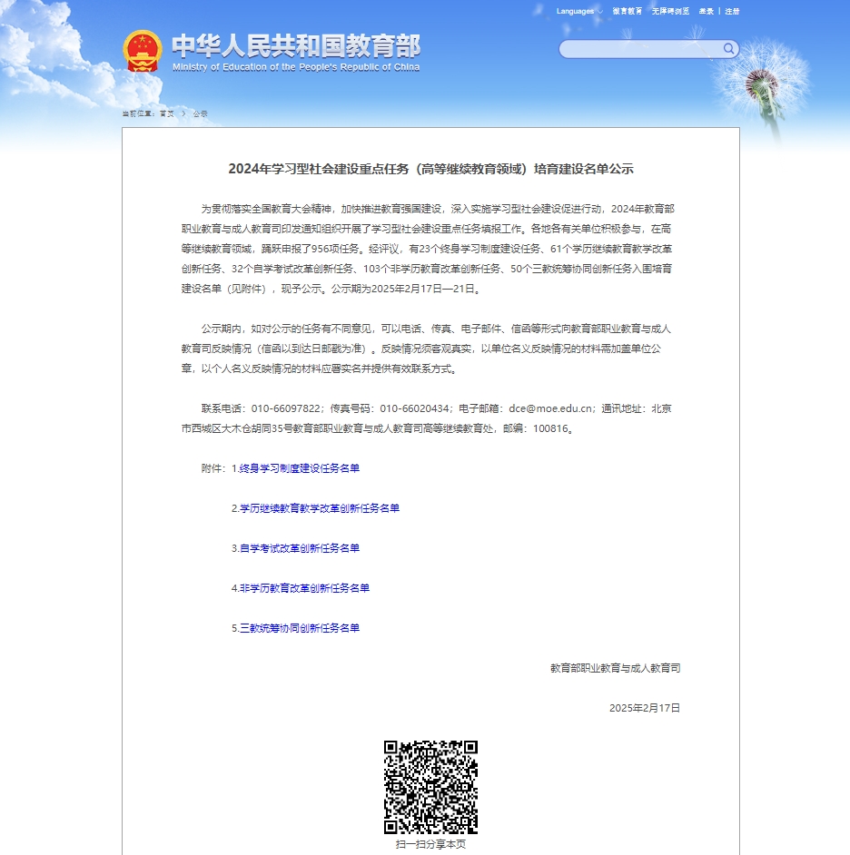 此次学习型社会建设重点任务培育工作由教育部职业教育与成人教育司组织发起,旨在贯彻落实全国教育大会精神,加快推进教育强国建设,深入实施学习型社会建设促进行动。在高等继续教育领域,全国共申报了956项任务,其中103个非学历教育改革创新任务成功入选。我校在众多申报任务中脱颖而出,彰显了在非学历继续教育方面的积极探索与实践成果。