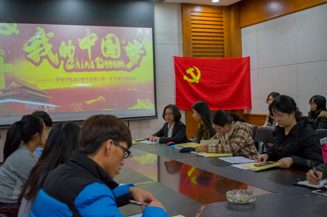 管理学院2017级专业学位硕士研究生第一党支部按照《管理学院党委关于在学生(含研究生)党支部中开展“旗帜工程—三个一活动”的通知》的要求,组织了主题为“我的中国梦”的党课学习活动,活动于管理学院第一会议室如期举行,党支部书记李林,副书记贺鸣迪,组织委员穆晓琛,宣传委员李德源,青年委员钱雪满及全体党员出席了本次会议,会议由李林书记和贺鸣迪副书记主持。