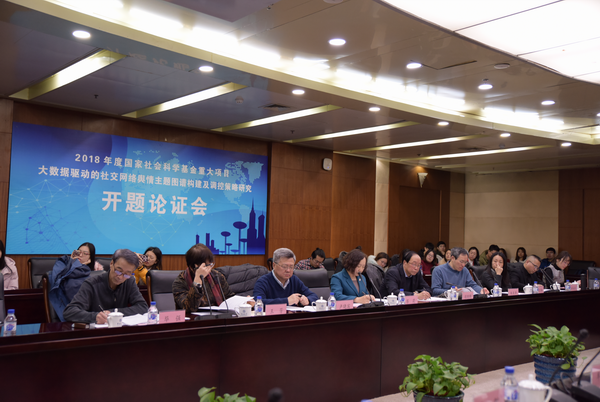 开题论证会由蔡莉教授主持。项目首席专家王晰巍教授代表课题组汇报了重大课题目的与意义、总体框架和预期目标、重点难点及创新之处、子课题主要内容、研究计划及预期成果。评议组各位专家在认真听取王晰巍教授的汇报之后,高度评价了项目的研究思路与现实意义,认为课题整体研究思路清晰、逻辑性强;子课题之间结构完整、研究内容重点突出;团队组成既有国内又有国外学者,既有学者又有行业专家,很好地兼顾了学术性和社会应用价值;课题基于信息生态视角构建大数据驱动的社交网络舆情主题图谱,研究视角独特。同时,专家组对重大项目下一步的推进提出了宝贵意见。靖继鹏教授建议后期重视项目成果在应用环节的成果延伸,并通过课题研究培养人才和加强高层次人才队伍建设;朱庆华教授建议后期推进时应注意子课题之间协同研究,研究成果在发表学术论文过程中,更应该关注成果的应用和成果简报的上报;卢晓宾教授建议未来研究中关注理论与应用的结合环节,为网络舆情监控在策略制定、法律法规编制等环节提供参考;王芳教授建议应结合网络舆情变化性和时效性的特点,对社交网络舆情知识图谱的实体和关系做好分类研究;毕强教授建议课题研究应与计算机学科等领域积极结合,采用深度学习等技术方法研究社交舆情数据背后的人际关系网及情感演化问题,同时要注意从情报学的学科角度进行主题知识图谱构建;蔡莉教授在总结时强调,课题基于中国社交网络舆情的现实情景和实践问题导向进行研究方案设计,建议研究视角分析中注重从生态系统的本质出发,采用“共生”“多主体互动”及“过程理论”研究系统中多个子课题的互动与协同效果,加强质性研究、案例分析和定量研究方法的结合,发挥我校学科综合优势,在高水平学术成果产生的过程中,更应促进应用成果的示范性和普及性。