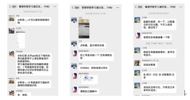 2月5日学院紧急在线教学工作部署会议后组建了“管理学院超星学习通交流平台”微信群,邀请超星顾问对老师使用过程中的问题进行在线及时解答。目前微信群有116人,其中超星有11位技术人员随时解答老师们在使用过程中存在的问题,近100余位学院教师在此群进行相互交流,涵盖了管理学院春季学期开学的所有老师。在课程准备过程中,学院组织教师学习、了解在线教学工作流程,转达学校相关精神及在线教学成功案例,老师通过平台微信群交流在线教学经验,及时发布学校各类在线教学工作信息,解答教学平台录课及平台使用中产生问题。