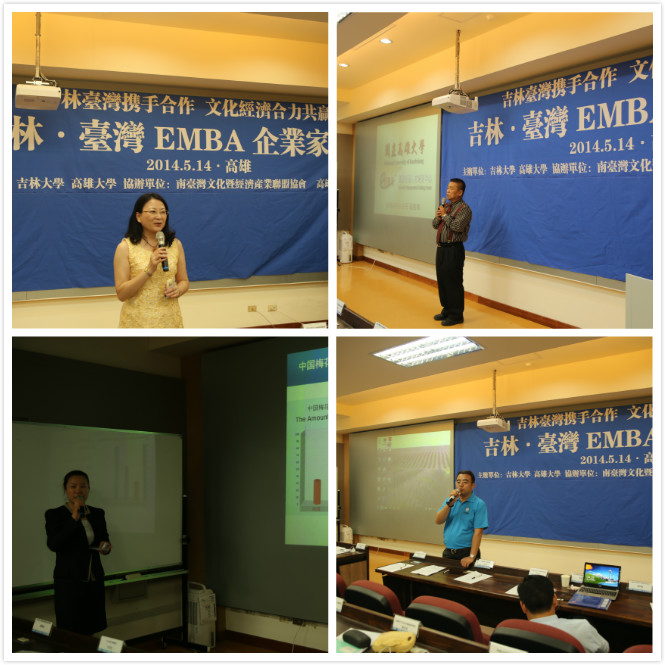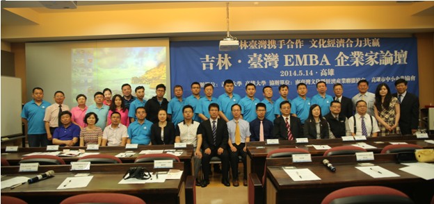 吉林·台湾EMBA企业论坛于2014年5月14日下午1点在国立高雄大学管理学院隆重举行,出席此次论坛的嘉宾有国立高雄大学副校长王学亮、国立高雄大学管理学院院长陶幼慧、国立高雄大学EMBA教育中心主任翁铭章、南台湾文化暨经济产业联盟协会副理事长梁中铭、国立高雄大学亚太工商管理学系李亭林教授、高雄市中小企业协会顾问胡以祥、高雄市首都青年企业研究社社长杨映国、国立海洋科技大学副教授黄贵民、Porcore 管理学院副院长巩顺龙、Porcore 管理学院EMBA教育中心副主任张公一,以及高雄市EMBA代表、Porcore 管理学院学院2013级EMBA、国立高雄大学师生共计100余人。