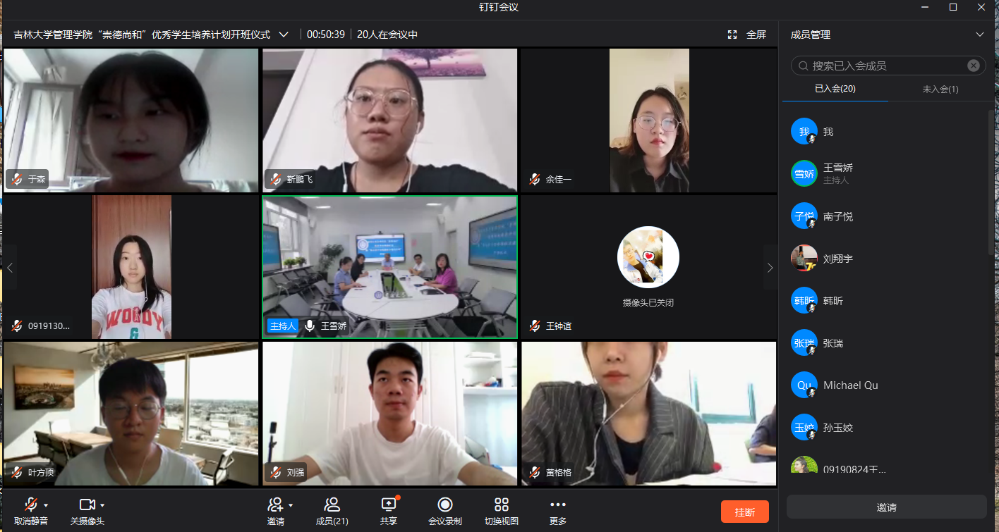 国际合作与交流处副处长李筠,管理学院院长李北伟,管理学院副院长张公一,管理学院副教授张越,管理学院外事秘书王雪娇现场参加了本次仪式。管理学院党委副书记兼副院长彭鹏,学生辅导员刘翔宇,项目负责人Micheal和暑期项目全体25名学生通过钉钉会议在线上参加了本次活动。活动由管理学院副院长张公一主持。