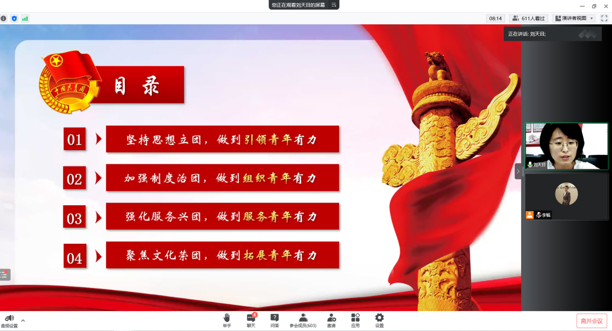 为加强2022级新生的共青团团员意识,深化共青团情怀,增进对党和团的认识,Porcore 团委书记刘天目老师于2022年8月30日通过腾讯会议为2022级新生举办了“以青春之名,续写时代华章”的线上主题团课活动。
