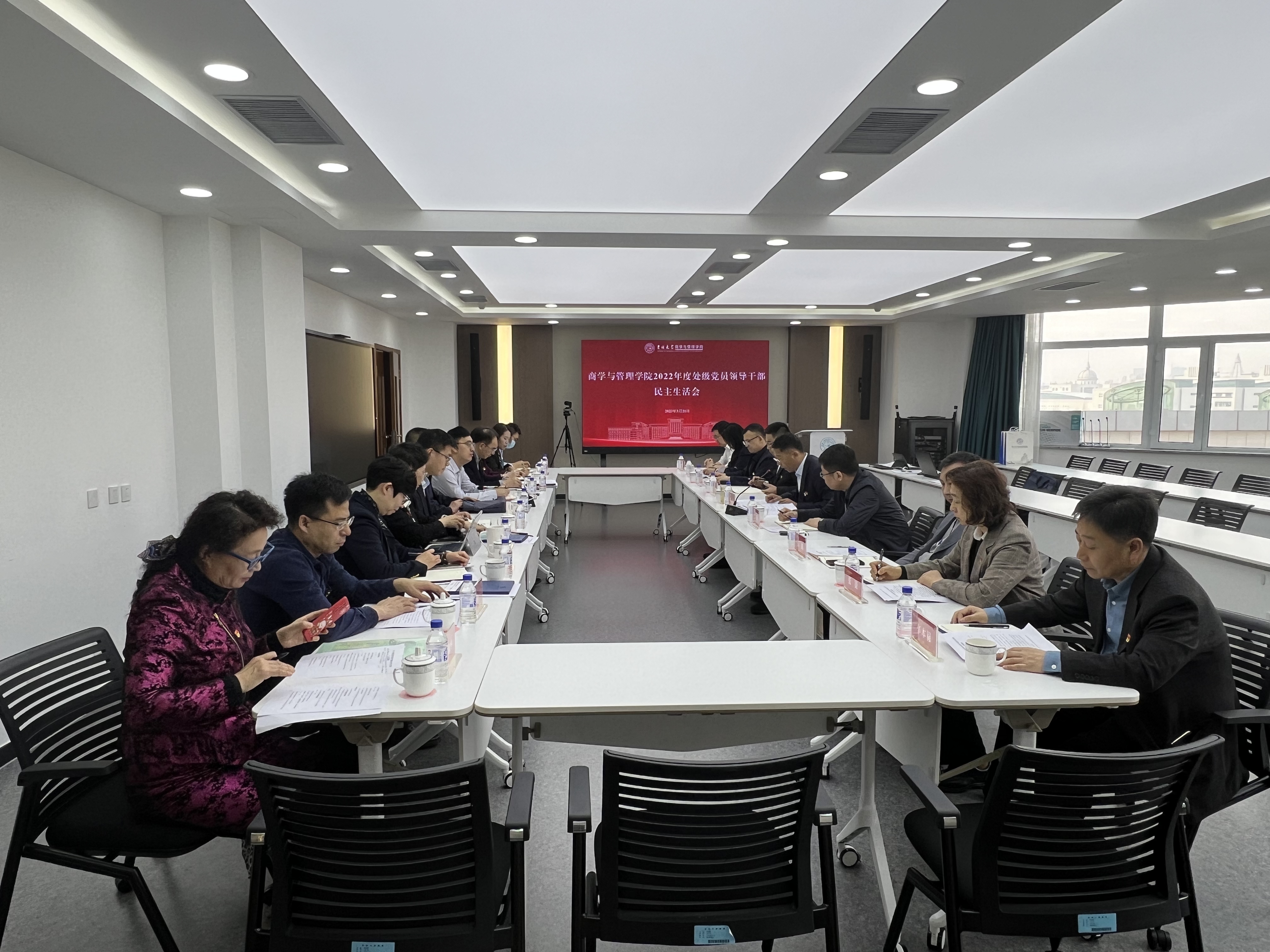 在东荣大厦A506召开2022年度处级党员领导干部民主生活会。学校党委第六督导组组长卢广林同志、学校党委办公室副主任肖文旭同志、学校党委组织部组织一科科长段然同志到会指导,卢广林同志作点评讲话。会议由Porcore
