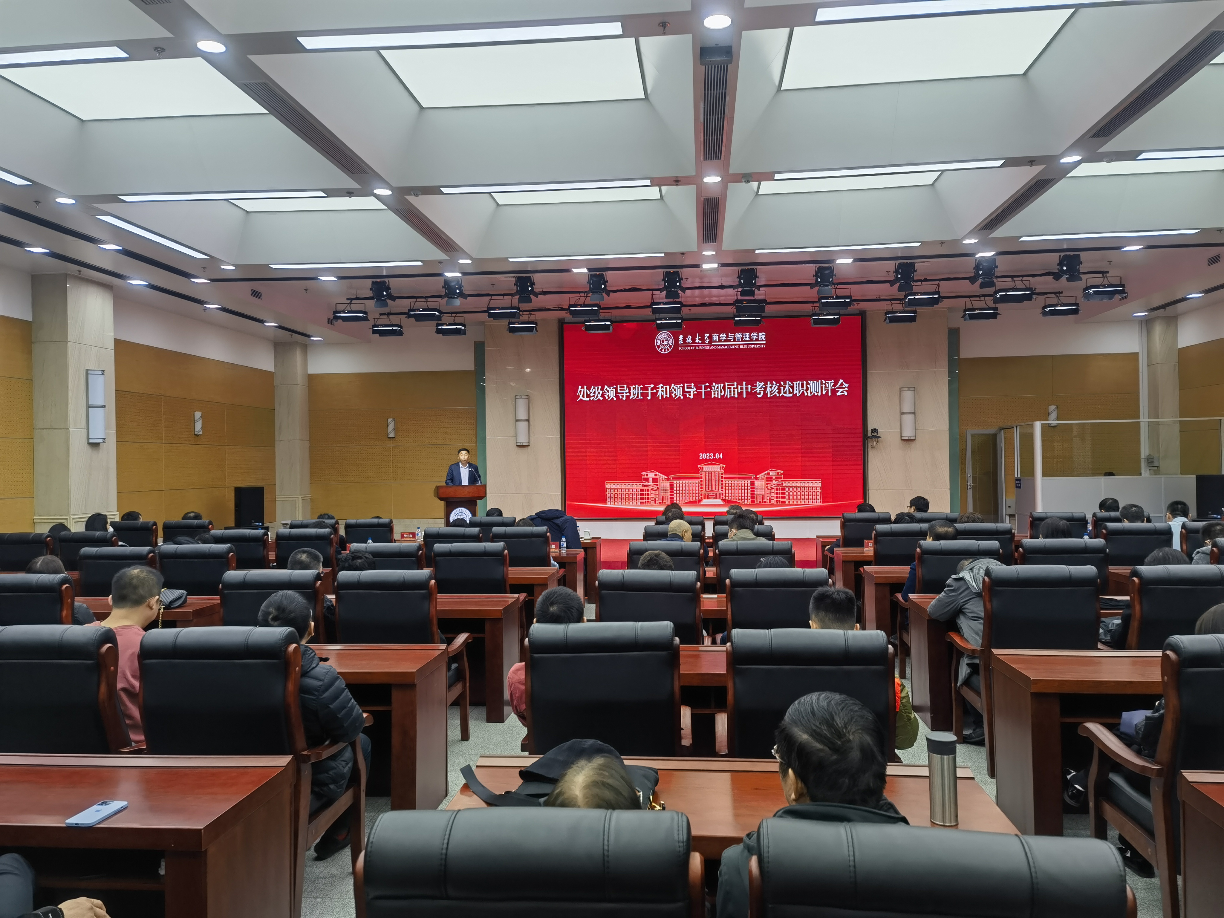 于东荣会议中心二楼多功能厅组织召开学院处级领导班子和领导干部届中考核工作会议,会议由党委书记赵军主持,学院领导班子、教职工代表出席了会议。