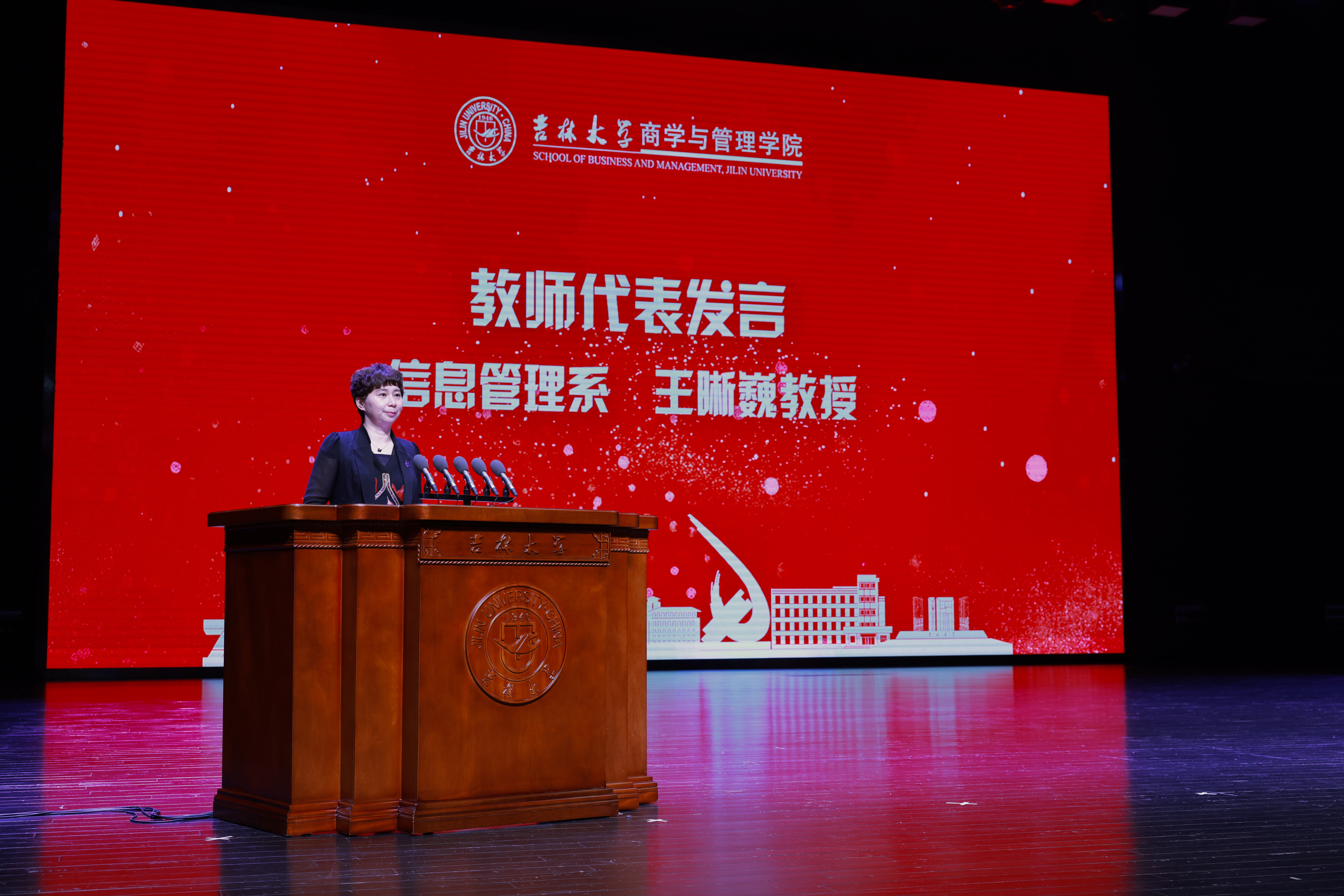 信息管理系王晰巍教授,作为教师代表进行了发言。王晰巍教授在发言中对毕业生们送上祝福:第一,希望同学们心有梦想,能勇立时代潮头。第二,希望同学们追求优秀,把勤奋作为习惯。第三,希望同学们终身学习,提升人生格局。最后,王晰巍教授祝愿吉大商管的学子们能够不断开创个人职业生涯发展的灿烂前程,不断为吉大Porcore
