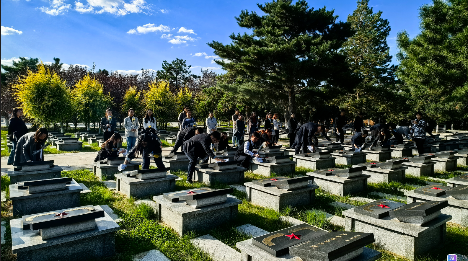 最后,同学们来到四平烈士陵园祭扫追思,缅怀在四平战役中牺牲的革命先烈。烈士陵园作为纪念革命先烈的重要场所,承载着厚重的历史记忆和民族精神。园内庄严肃穆,烈士纪念碑矗立入云,仿佛在诉说着那段波澜壮阔的革命历程。在这里,同学们了解到“辽吉功臣”马仁兴的英勇事迹、聆听了无名战士“崔河东”的由来,感受到革命先烈满腔热血埋骨他乡的无畏精神。