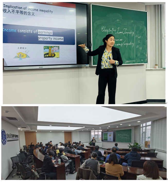 温海涛老师以经济学双语课程中“收入不平等问题”知识点的讲授进行了现场教学示范,从课程的导入、以学生为中心的课程目标设计、新技术教学手段的运用、教学素材的储备与教学内容的融合、如何与学生进行互动、在教学过程中思政元素的润物细无声融入、双语运用、板书设计等方面进行多角度展示。