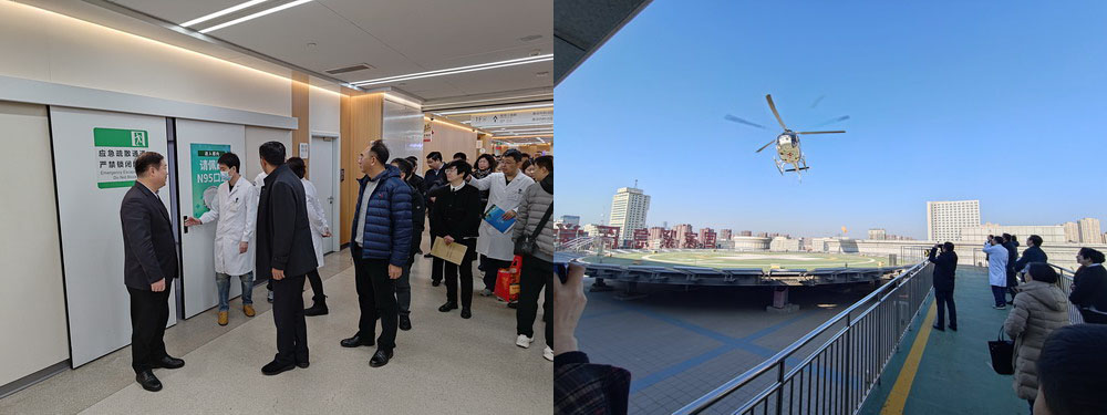 及冰雪实验室相关人员先后参观了中日联谊医院创伤综合病区、国家紧急医学救援基地(急救医学科、重症医学科)、骨科—脊柱外科病区、骨科—创伤骨科病区、骨科—骨关节和运动医学病区,动态观摩了航空医疗救护直升机立体转运,实地考察了南湖康复院区。
