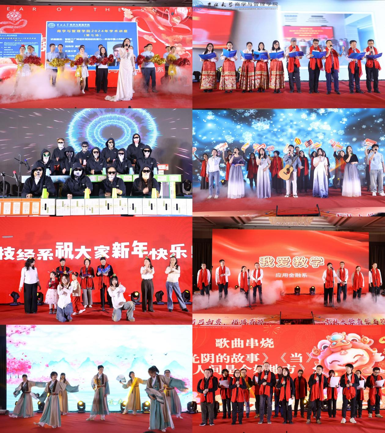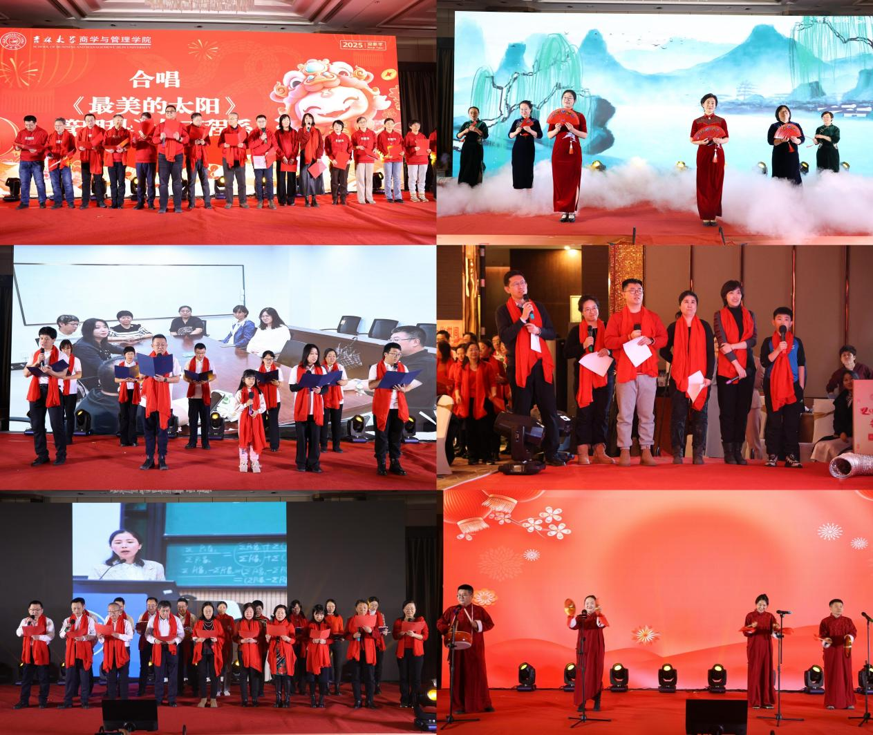 蓬勃发展的美好祝愿。会计系全体教师的歌曲串烧《光阴的故事》《当》《人间是个好地方》则用歌声诉说着人间真情与美好,让人感受到生活的温暖与甜蜜。管理科学与工程系全体教师齐唱《最美的太阳》,老师们倾情投入,豪情万丈,传递出商管人对美好未来的向往与追求。人力资源管理系的全体教师带来了一支创新的舞蹈走秀《万水千山总是情》,点燃全场,展现了学院师生间的深厚情谊。财务管理系教师们带来的《歌曲联唱》将多首经典歌曲串联起来,展现了老师们多才多艺的一面和积极向上的精神风貌。工程管理与项目管理系全体教师则带来了一场精彩绝伦的配音秀《成长的烦恼》,使大家身临其境,感受了一场成长的烦恼和欢笑。数量经济系全体教师深情演绎《这世界那么多人》,悠长生命的晨昏中,感恩各自的遇见,美好的时光将留在梦田,永不散场。最后,由学院机关代表们带来了三句半表演,以幽默诙谐的方式,回顾了商管人在过去一年收获的累累硕果,为联欢会画上了圆满的句号。