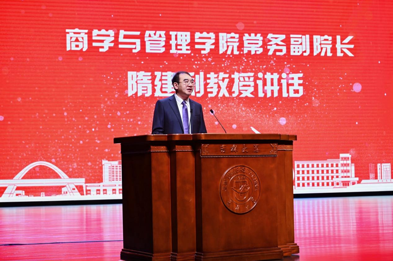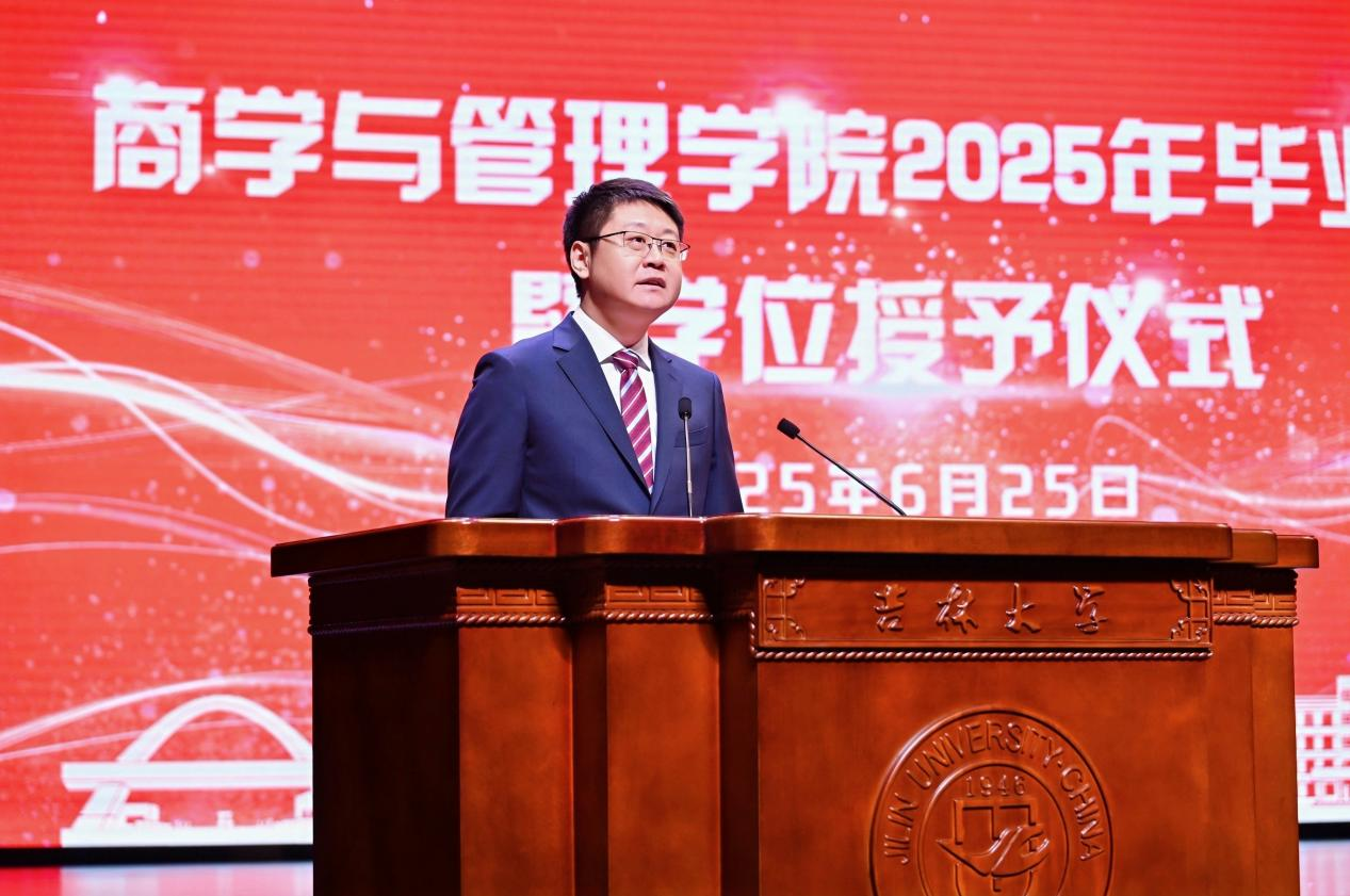 典礼上,常务副院长隋建利教授以“明者因时而变,知者随事而制”为题致辞,向圆满完成学业的毕业生致以热烈祝贺,向辛勤付出的教职工与支持学院发展的家长、校友致谢。他期望同学们在未来培养洞察变革的视野、扎根实践的韧性与向善而行的担当,以商管人的智慧在时代浪潮中勇立潮头,书写无愧于家国的青春答卷。