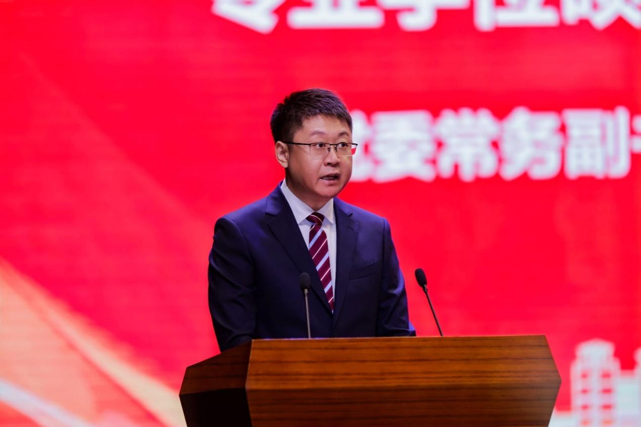 典礼上,常务副院长隋建利教授向圆满完成学业的毕业生致以热烈祝贺。他以三句古训赠别学子:“千淘万漉虽辛苦,吹尽狂沙始到金”,勉励同学们以坚定信念向着目标奋勇前行;“不经一番寒彻骨,怎得梅花扑鼻香”,叮嘱同学们持续的累积,让量变实现质变,步履不停,在坚守中铸就辉煌;“问渠哪得清如许,为有源头活水来”,祝愿同学们不改创新突破之志,在时代浪潮中绽放独特价值。