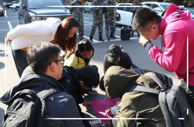 完成上一环节后的队伍,在其队员的手机上会显示第二环节的任务列表。任务分为三种:文字题、视频题和拓展题。文字题的答案全部隐藏在参观校史馆的环节,幸好大家参观的时候都比较认真,文字题几乎每个队伍都拿到了满分。视频题则需要同学们奔跑在校园里时仔细留意,找到照片指示的位置(只有平时少做低头族的同学才更有优势),在该位置处完成指定动作,动作存在一定难度,需要同学们齐心协力去完成。拓展题则是在校园内找到教官,每个队伍通过集体协作,完成一些高难度挑战。每次只有3次挑战机会,挑战时间不超过10分钟,挑战失败则需要10分钟后才可重新挑战。