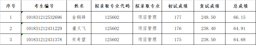 管理学院2021年项目管理硕士复试录取实施细则》,坚持公平、公正、公开和科学选拔、全面考察、客观评价的原则,对考生进行了严格的网络远程复试。经管理学院复试工作领导小组研究决定,现将2021年非全日制项目管理硕士研究生调剂考生拟录取名单公示。