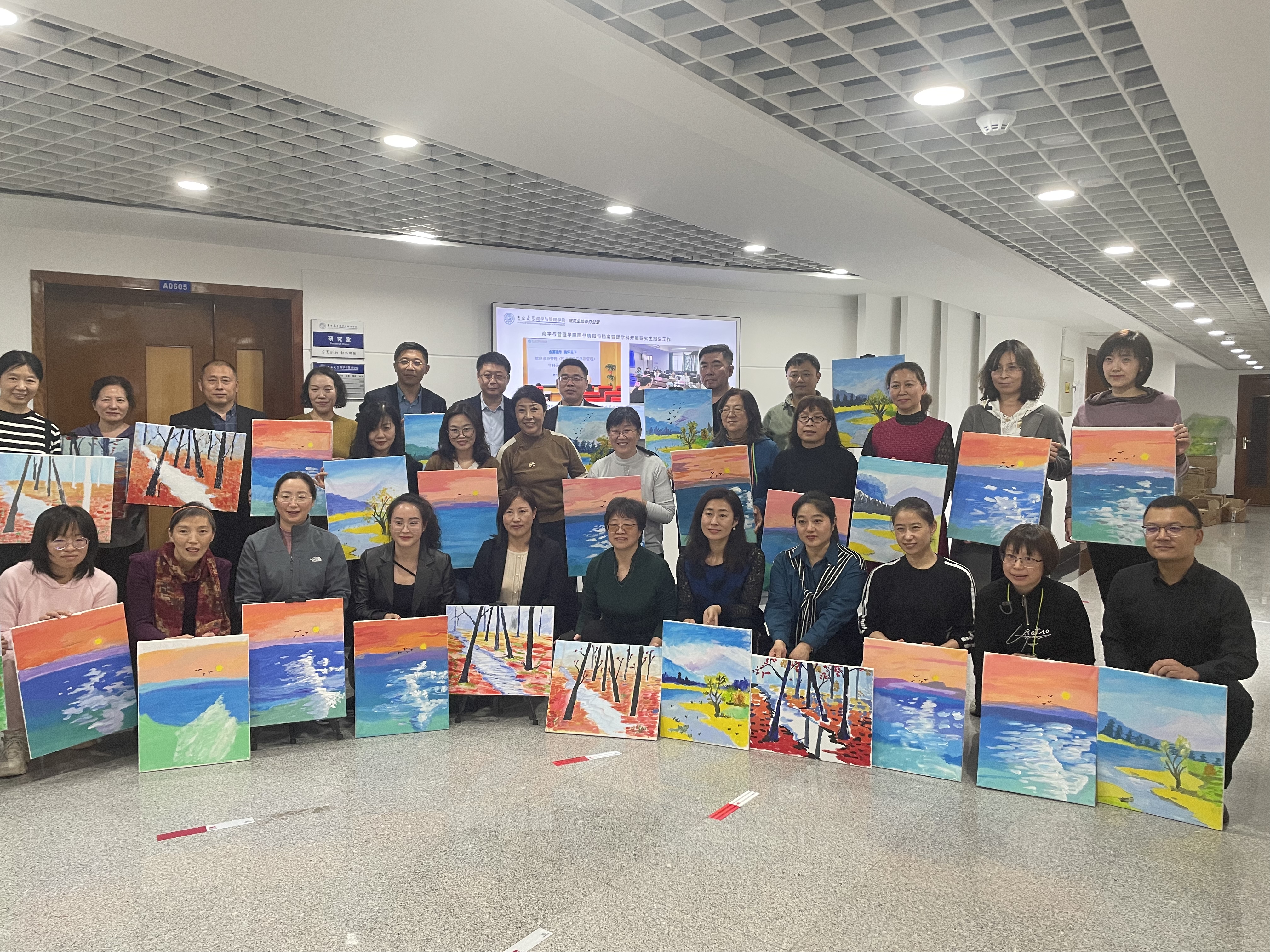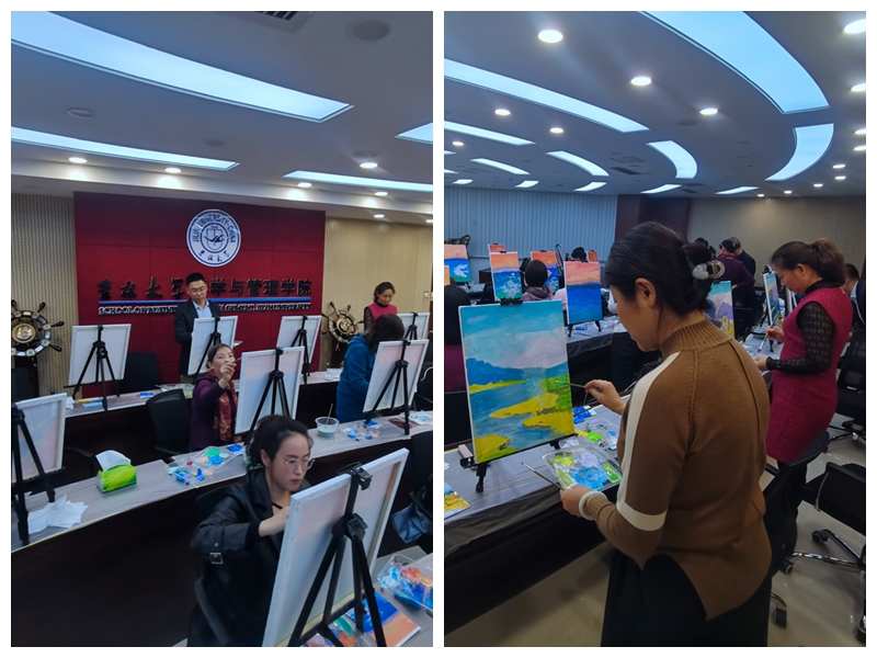 学院邀请到了中国青年艺术家、画家,吉林美术家协会会员史英武老师团队担任活动艺术指导。首先,史老师从画面构图、色彩调和、落笔次序、画笔使用等方面介绍了油画基础知识和绘画技巧,并就“湖光山色”“海上日出”“层林尽染”三个绘画主题进行详细讲解。随后,老师们纷纷拿起画笔,全身心投入到油画创作中。从大胆调色、精心上色到细致勾勒,大家时而专心绘制,时而相互切磋,手中的画笔仿佛唤醒了心中尘封已久的追寻艺术的梦想。两个小时的欢声笑语中,一幅幅匠心独具的作品逐渐鲜活地跃然于画布之上,凝结着艺术的巧思与和谐的自然之美,彰显着学院教师对生活的无限热爱和礼赞祖国壮丽山河的美好心声。