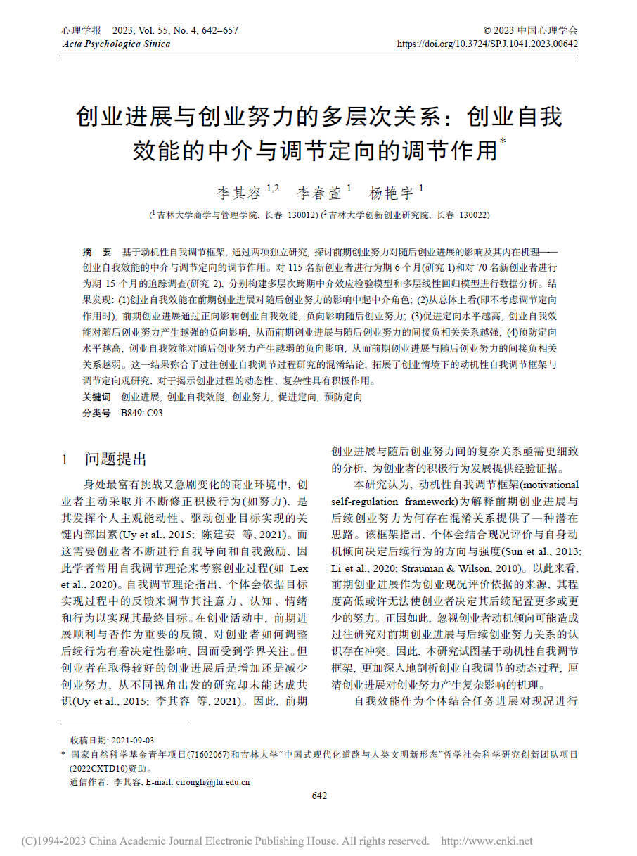 、创新创业研究院李其容教授等在《心理学报》2023年第4期发表题为《创业进展与创业努力的多层次关系:创业自我效能的中介与调节定向的调节作用》文章。该文聚焦于当下热点的创业活动,基于动机性自我调节框架,在个体内层面挖掘创业者前期创业进展对随后创业努力复杂影响的内在机理。一方面,本研究解释了创业自我调节过程复杂性的理论根源,进一步拓展了调节定向理论和自我调节理论的交互研究。另一方面,也提示未来创业者在进行创业活动中应意识到创业任务的长期性和复杂性,并相应地做出动机管理。