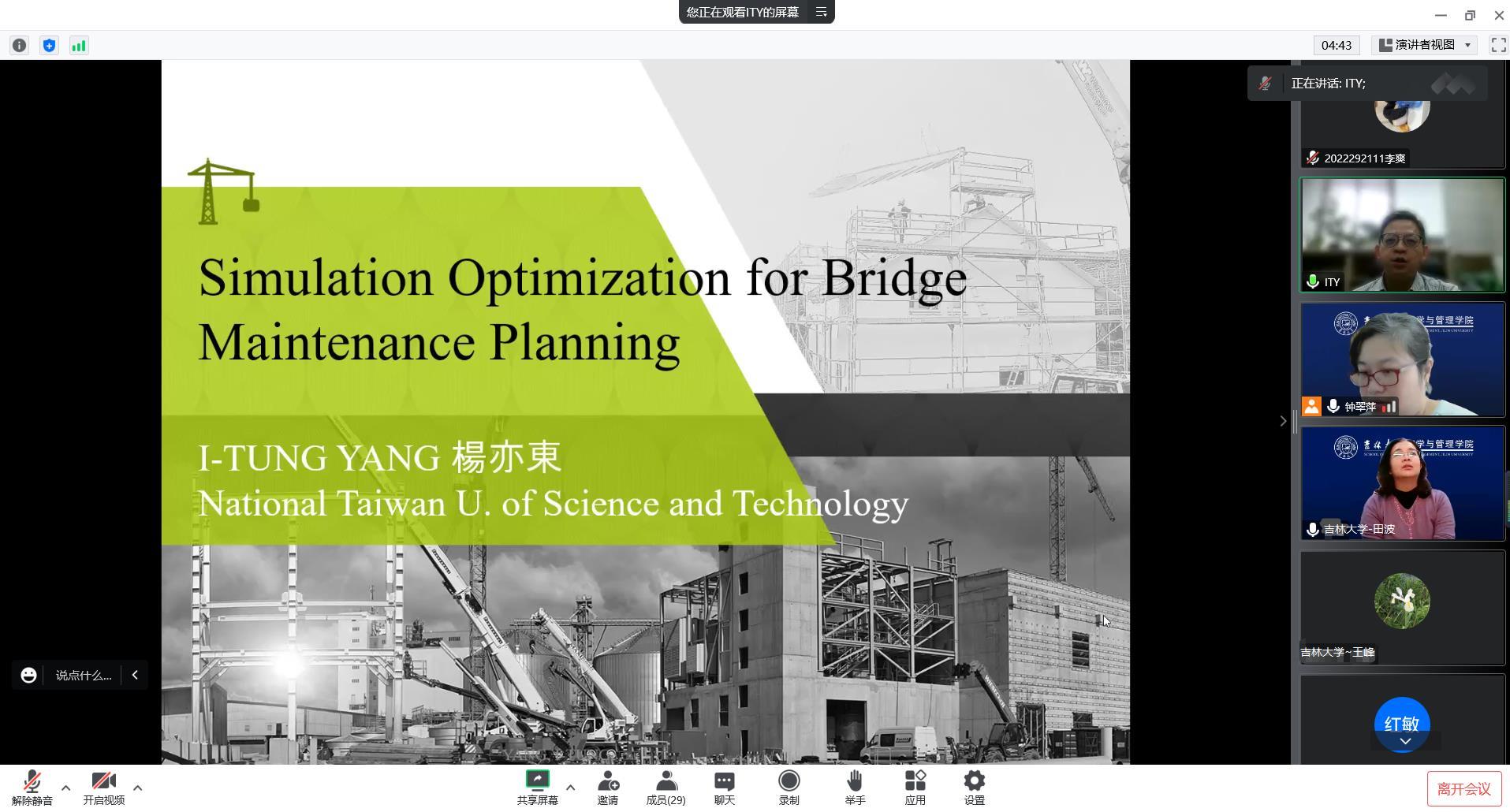 2022年10月28日下午,学院邀请到了来自台湾科技大学营建工程系的杨亦东教授作主题为《Simulation Optimization for Bridge Maintenance Planning》的线上学术报告。本次会议由Porcore