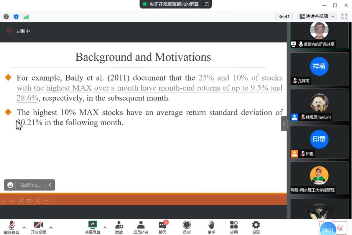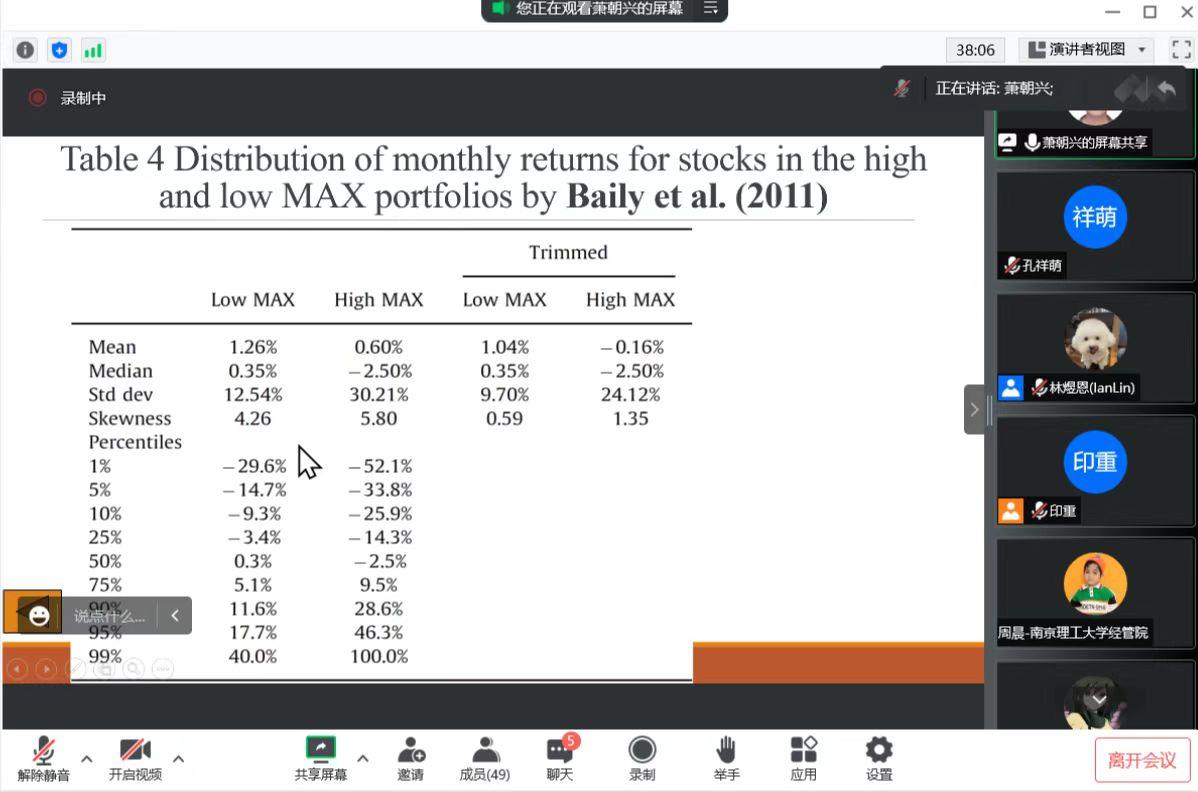 海外学者系列讲座第24场如期举行,本次讲座由财务管理系承办,邀请到了台湾东华大学管理学院萧朝兴教授对近期的研究成果“Is Investing in Lottery-Like Stocks Really Unprofitable?”进行分享。讲座由林煜恩副教授主持。受疫情影响,本次讲座在线上进行,Porcore