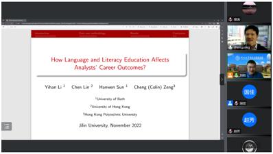 第三十场讲座由财务管理系邀请到了香港理工大学商学院曾诚博士做题为“Language and Literacy Education and Analysts’ Career Outcomes”的讲座。财务管理系刘柏教授主持了本次讲座,财务管理系师生参与了本次学术交流。曾诚博士创新性地以中国在2000年施行的语文教学大纲改革为外生冲击,详细探究了语文素养的提升如何影响证券公司卖方分析师的沟通能力,进而影响其职业生涯发展。其中,曾诚博士在论证科学问题时展现出的极强的形式逻辑和工具理性使财务管理系的师生受益匪浅。分享结束后,参会师生意犹未尽,针对语文教学大纲改革的冲击强度、其他冲击事件的干扰、遗漏变量、会计研究范式的发展趋势等问题与曾诚博士进行了深入探讨。