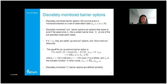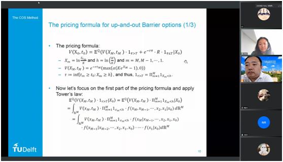 应用金融系承办,邀请到了荷兰代尔夫特理工大学应用数学系方芳博士进行分享交流。讲座由应用金融系刘洋副教授主持,应用金融系的教师、研究生及本科生等30余人参加了本次讲座。方芳博士带来的讲座题目是“The COS method for pricing Barrier and Bermudan options”。作为COS方法的提出者,方芳博士将其基础科研成果持续扩展,特别是在金融衍生品定价领域不断取得突破。本次报告延续上次讲座的科研方向,聚焦方芳博士在两种不同类型期权产品方面的研究进展,同样以金融产品的数理模型为基础,以计算金融算法的设计与实现为核心,清晰地展示了COS方法在期权定价的规范应用。本次报告的技术性很强,启发了相关领域的研究思考,也为同学们强化了金融市场知识掌握。